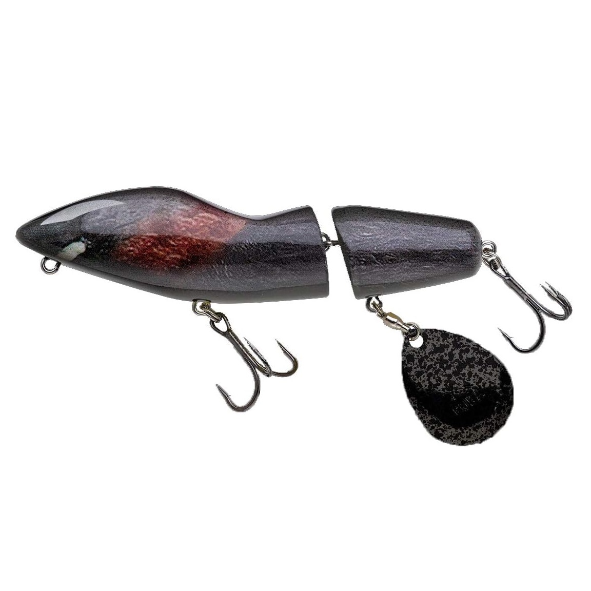 一般的なボディに接触させるためのブレードと異なり、リトリーブすると回転せずに左右へ大きくスイングし、ブレードの重さと慣性によってボディを水中へ沈ませようとするチカラが生まれ、“フカフカ”アクションを発生させます。
