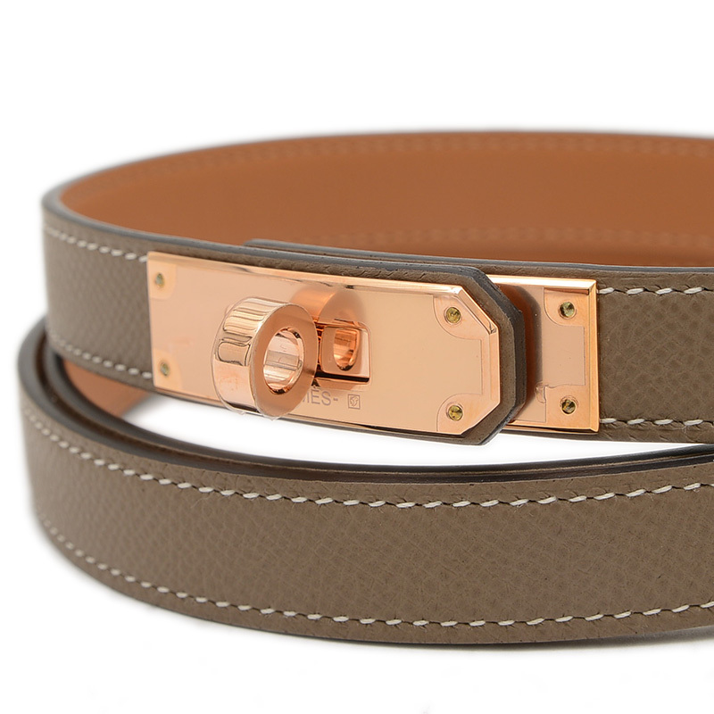 商品特徴 | エトゥープのグレージュにローズゴールドがよく映え、硬く型崩れしにくいエプソンレザーが長く美しさを保つ、毎日の装いに洗練のアクセントを添えるケリーベルトです。 |