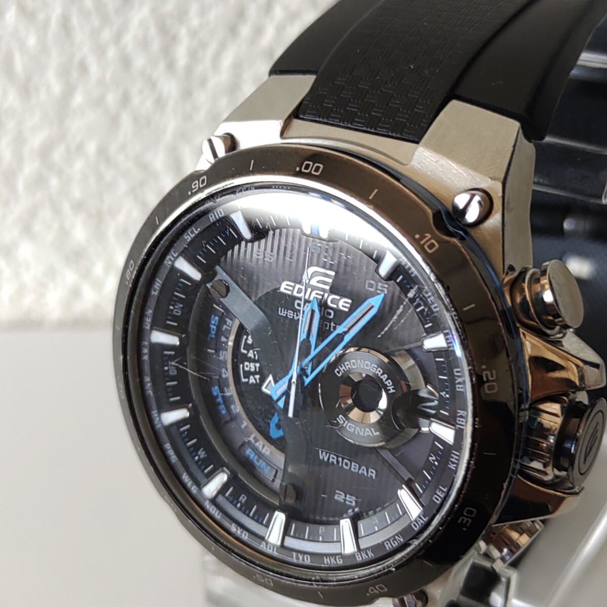 2層構造の文字盤にモード表示やラップ数表示を行う大型ディスク針を組み合わせたメカニカルなデザインが特徴的。3時位置の小窓は、ストップウオッチの停止時には赤、スプリットタイム計測時には青といった具合にモータースポーツのシグナルに見立てて表示します。