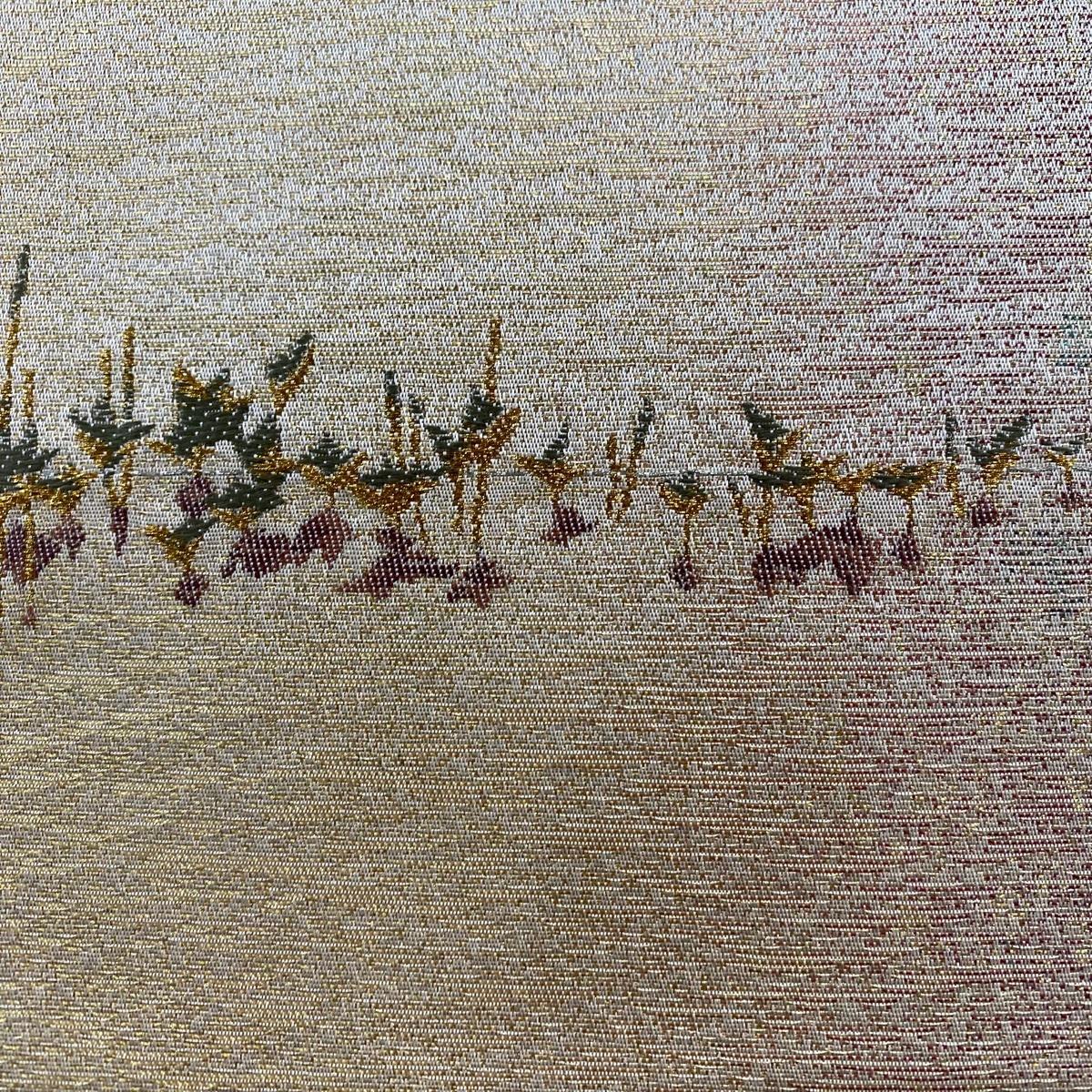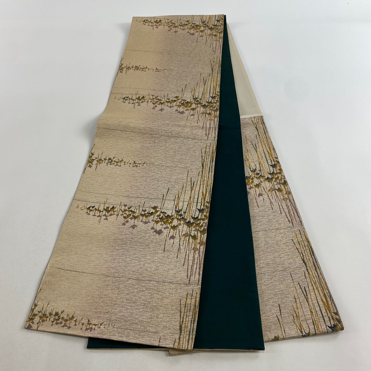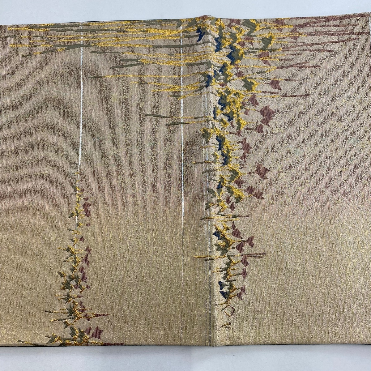 | 袋帯 美品 名品 草野一騎 落款 霞 葉柄 金銀糸 箔 薄茶色 六通 正絹 【中古】 |