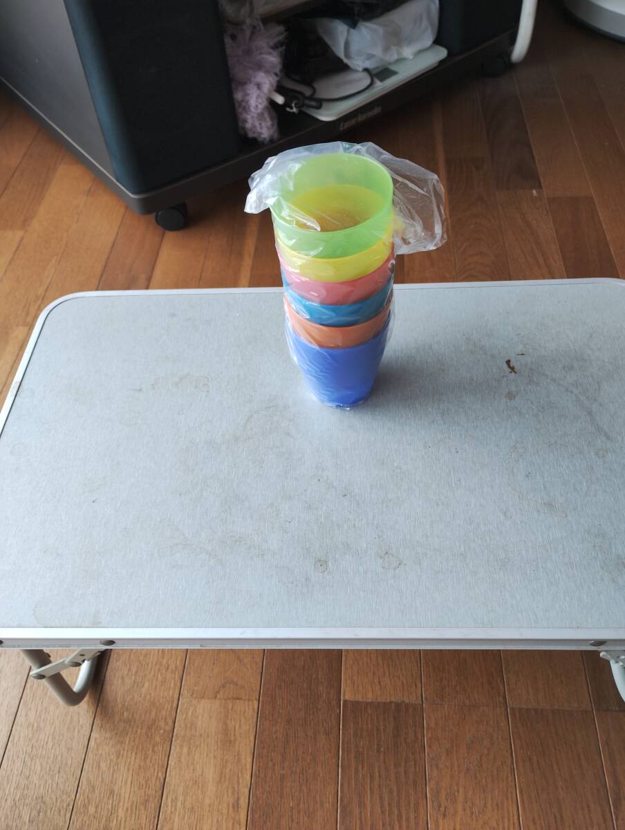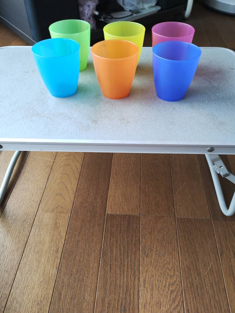 カラフルなプラスチック製コップ6個セット。中古ながら消毒清掃済みで子供に最適。
