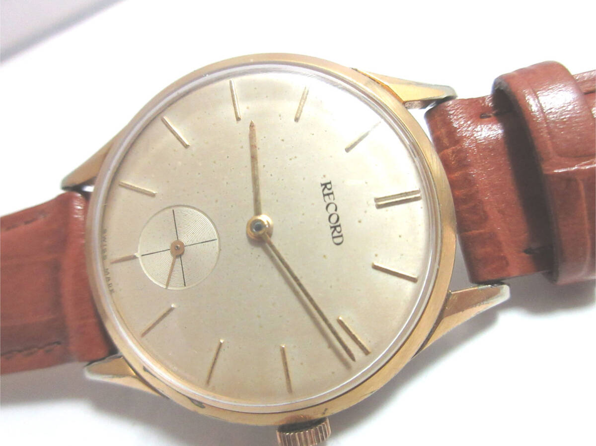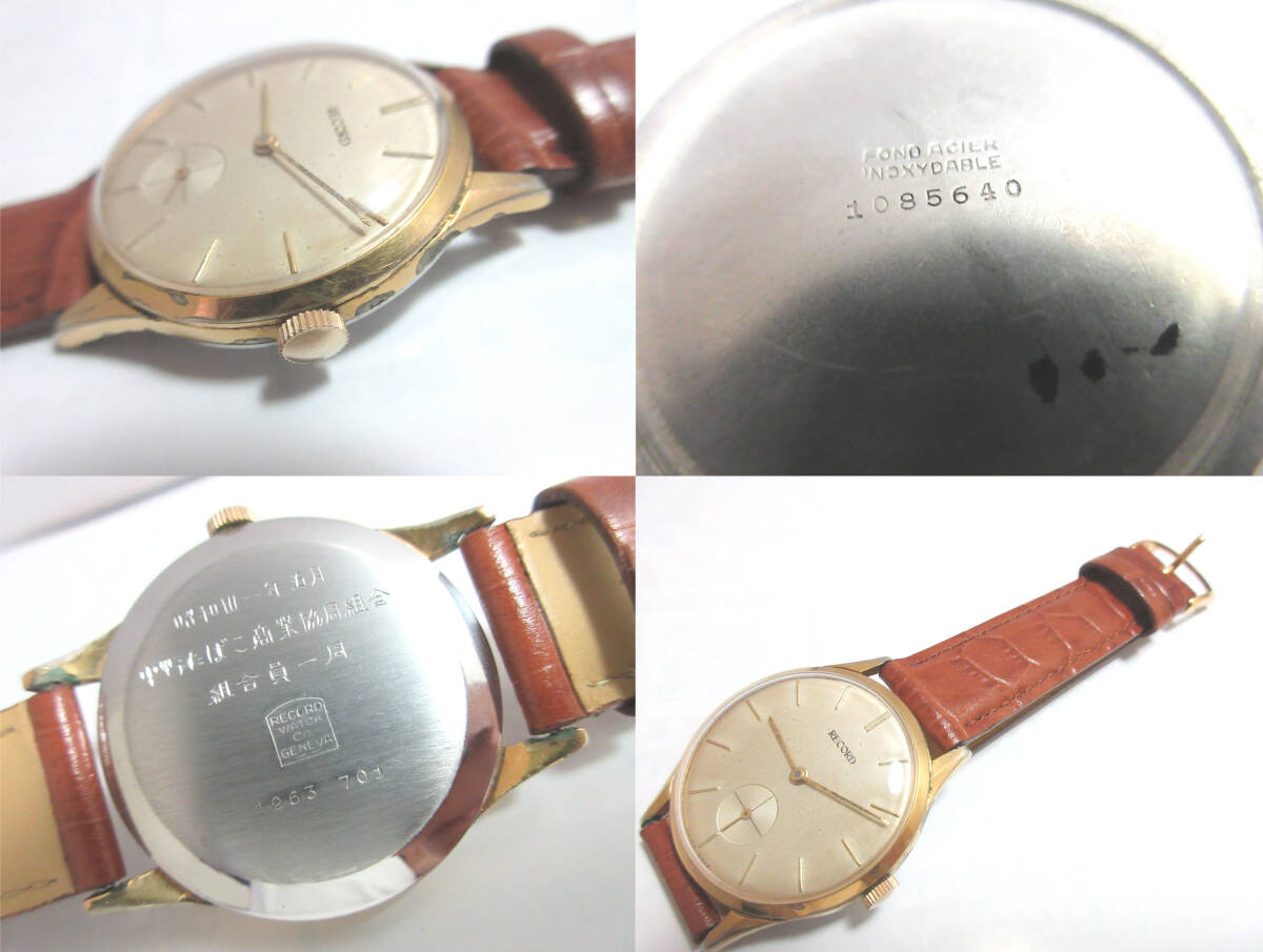 新規の方は、ご購入の意思がある事をお手数ですが質問欄よりご連絡下さい。ない場合は、申し訳ありませんが削除させて頂きます。1950年代製造、径:33mm(リューズ除く)金色(裏蓋ステンレス)ラグ幅:17mm。文字盤:オリジナルでよごれ、いたみあり。風防:プラスティック製、肉眼でわかる傷なし。ケース:小傷、いたみあり。機械:手巻き、動作しますが未整備です。ベルト尾錠:社外。古い物ですので現状でお願い致します。こちらも見落としがある事もありますので、あくまでもジャンク扱いでお願い致します。 また、ご入札頂いてる方でマイナス評価が多い等当方の判断で不適切と思われる場合、入札を取り消させて頂きますのでご了承下さい。