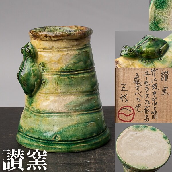 | 「讃窯」在銘の筒。桐箱有。 画像では印が判読できないと思いますが、光の向き変えながら現物を確認 すると、かろうじて「讃窯」の文字確認いただけると思います。 箱書きの「三好一」について、詳細は分かりかねます。 サイズは、幅約8.5cm、高さ約10cm。 傷・直しありません。 状態、詳細は画像でご確認ください。 |