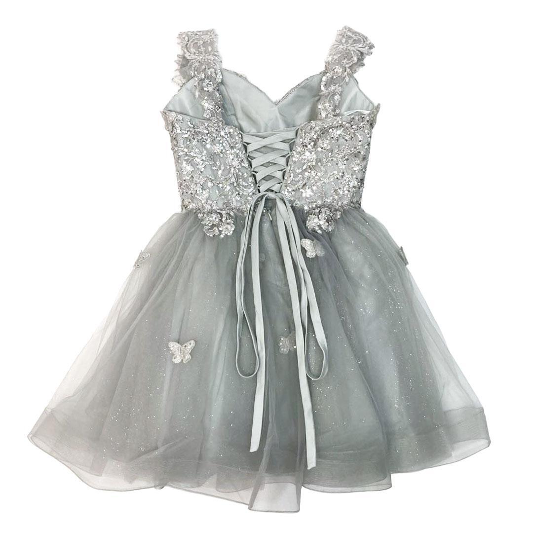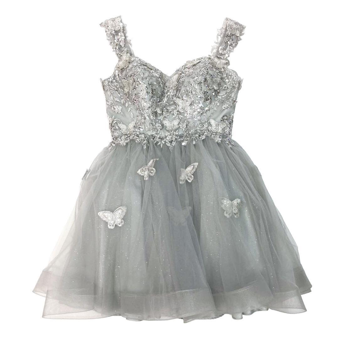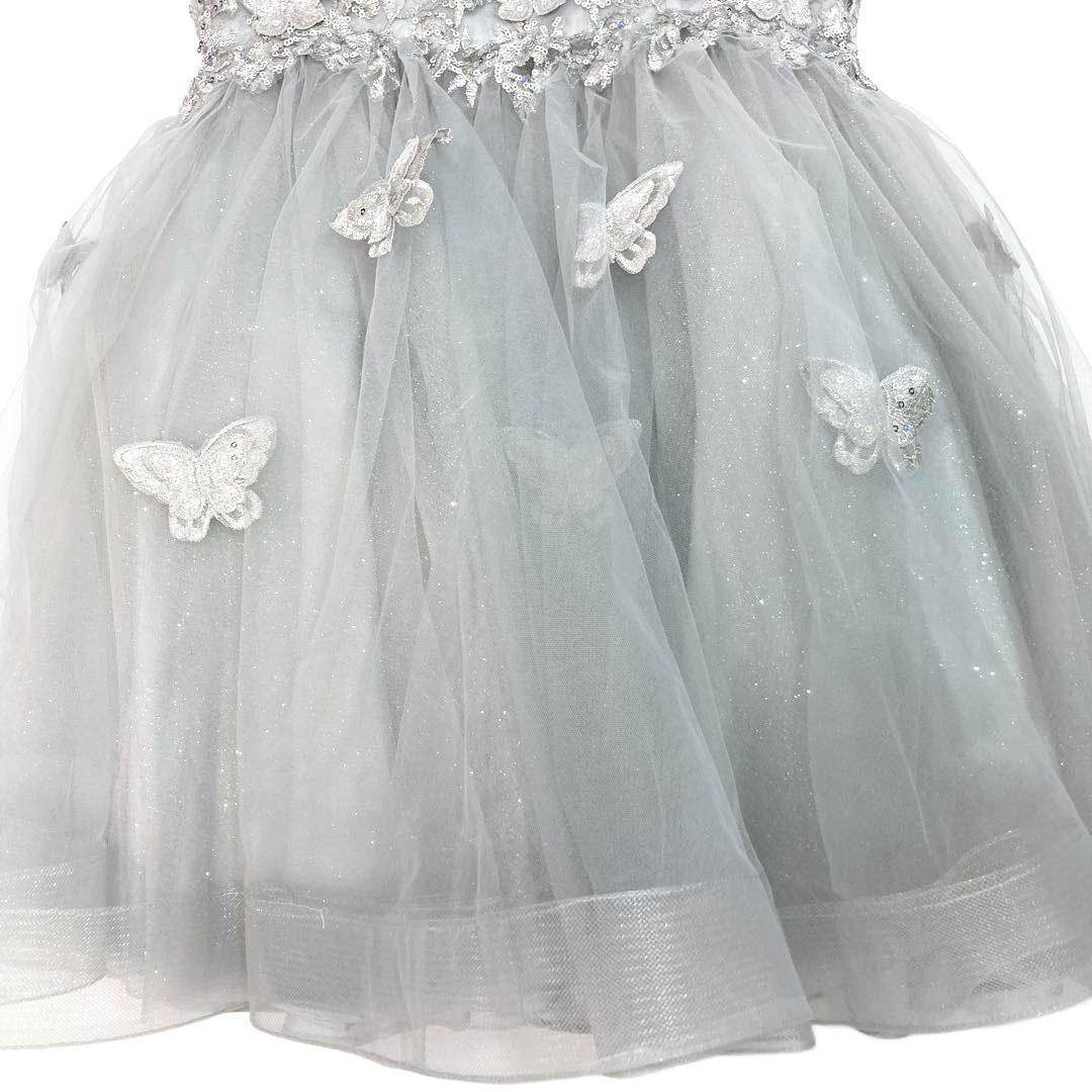 ラメがキラキラと輝くチュール素材と、立体的な蝶々のモチーフが可愛らしいミニドレスです。