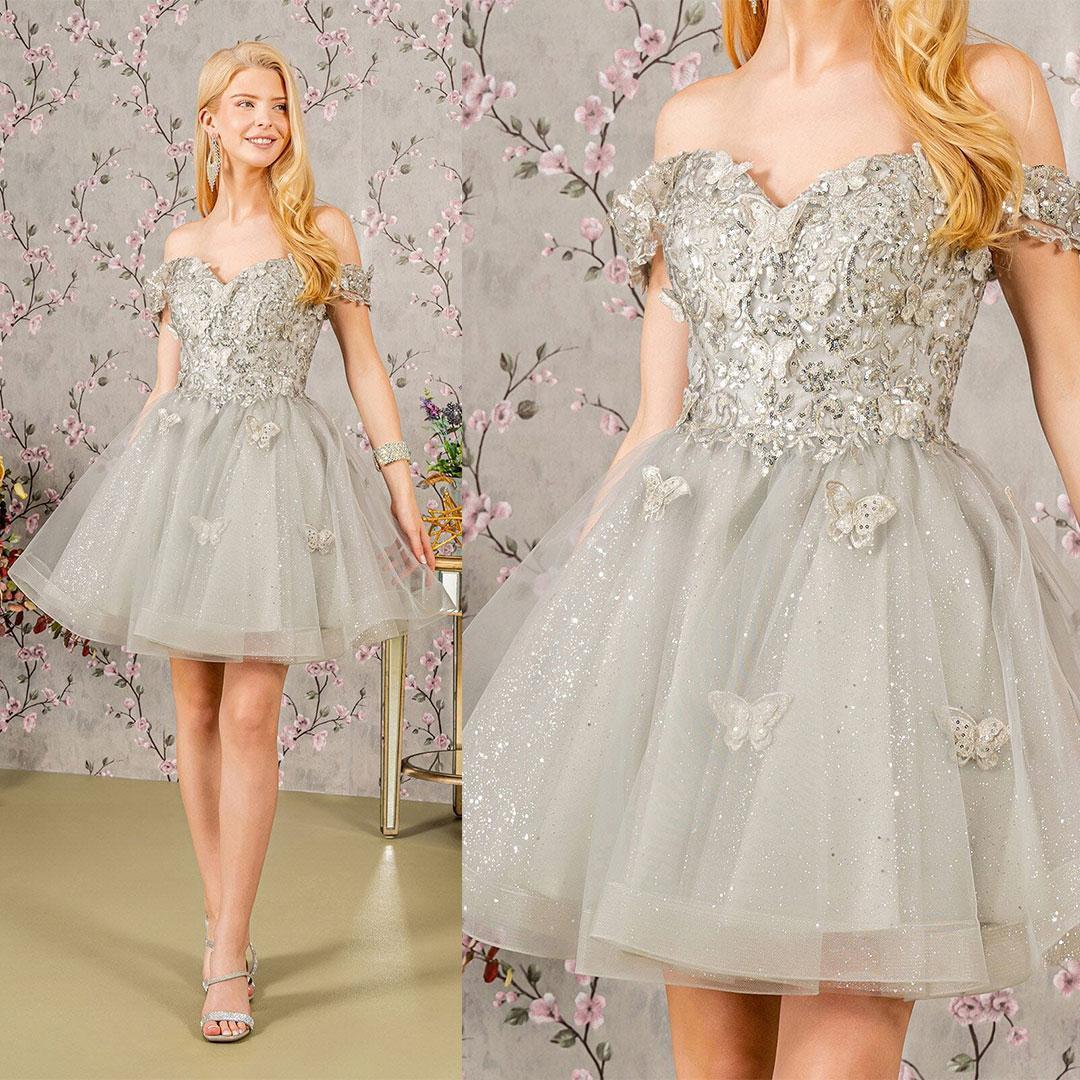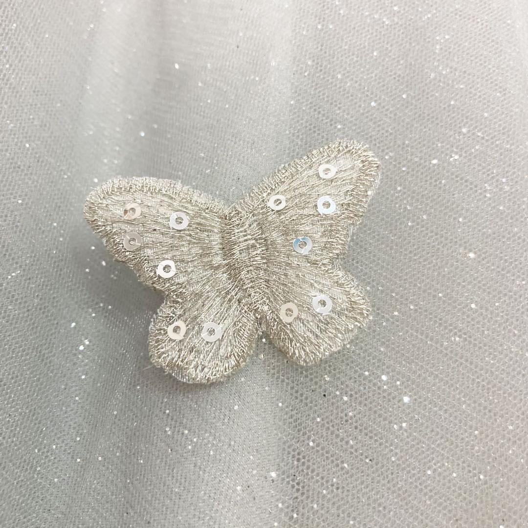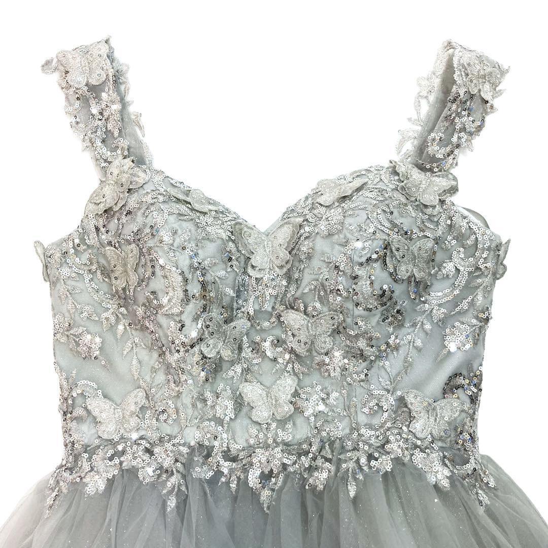 ラメがキラキラと輝くチュール素材と、立体的な蝶々のモチーフが可愛らしいミニドレスです。
