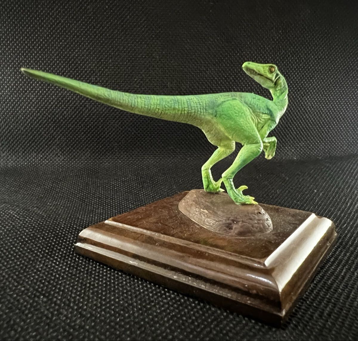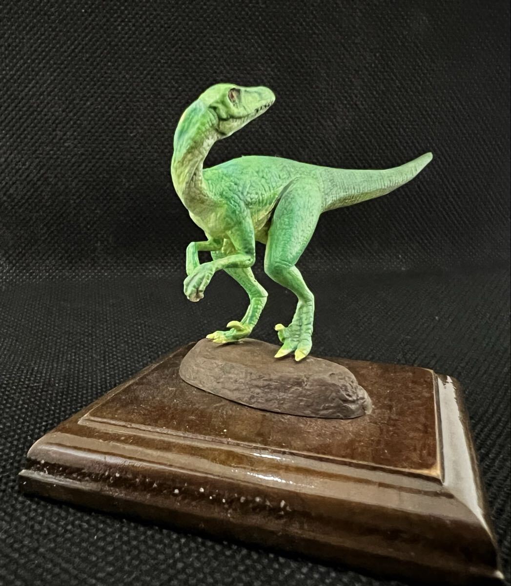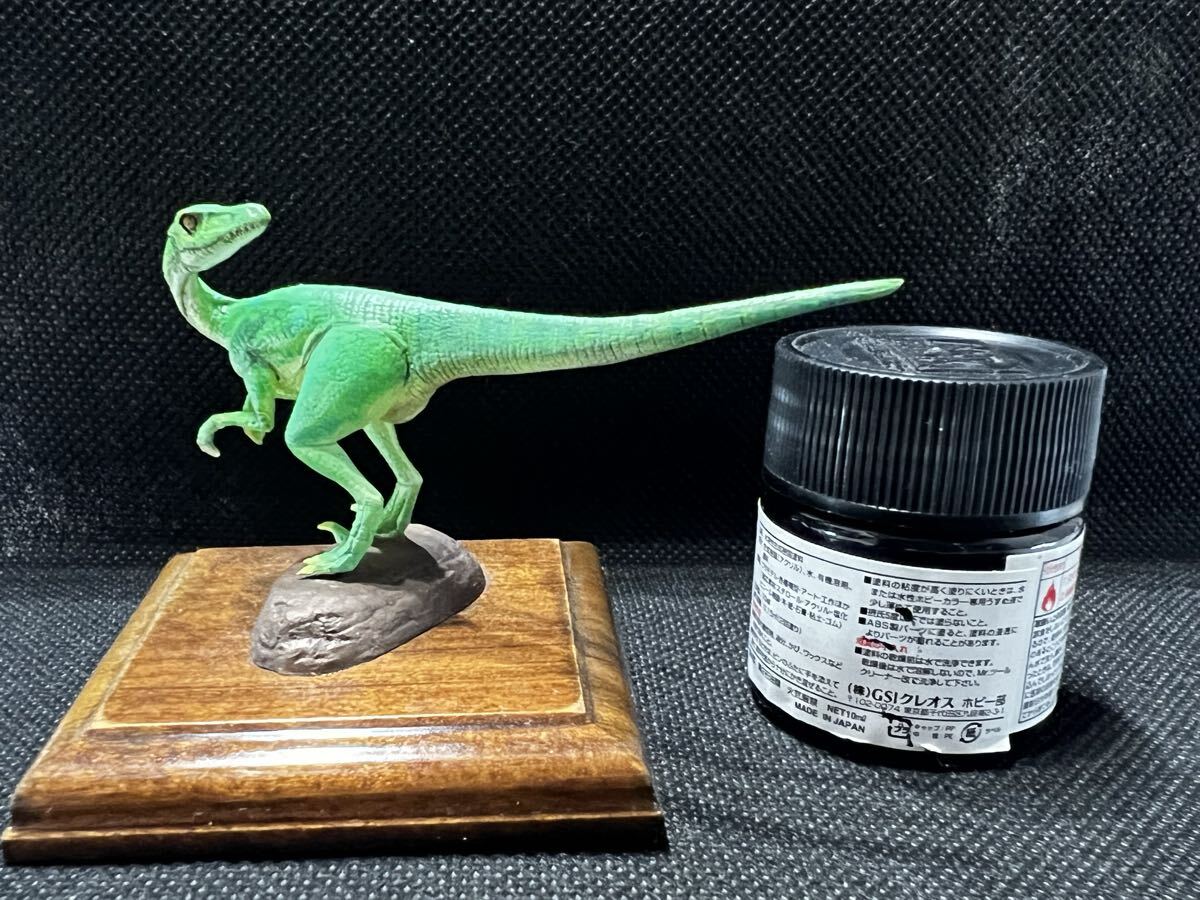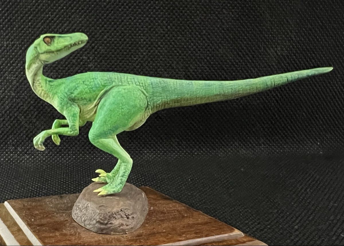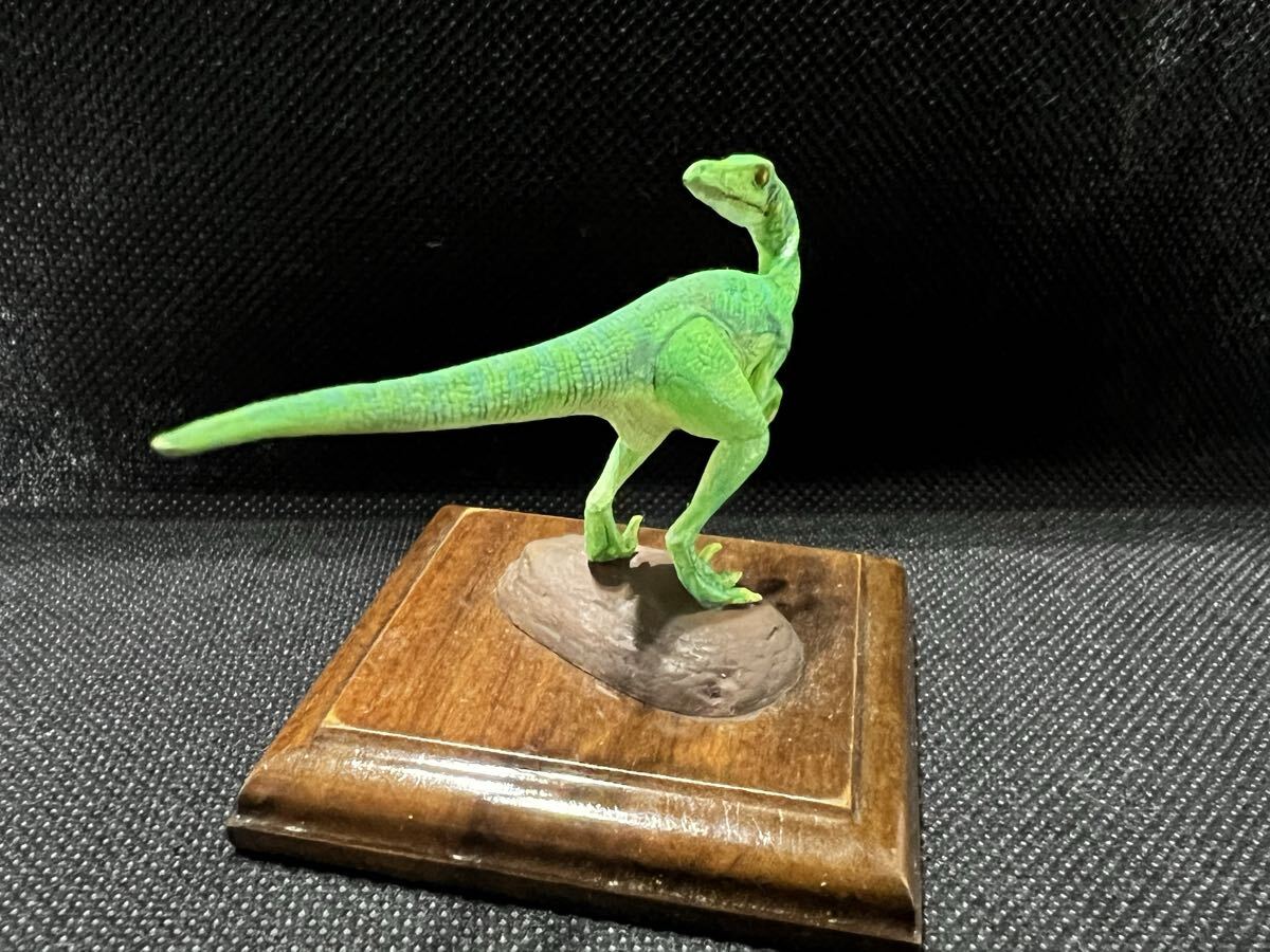 サイズですが飾り台は4辺幅6cm、ベロキラプトル飾り台を含む高さ約6cm、横8.5cmとなります。