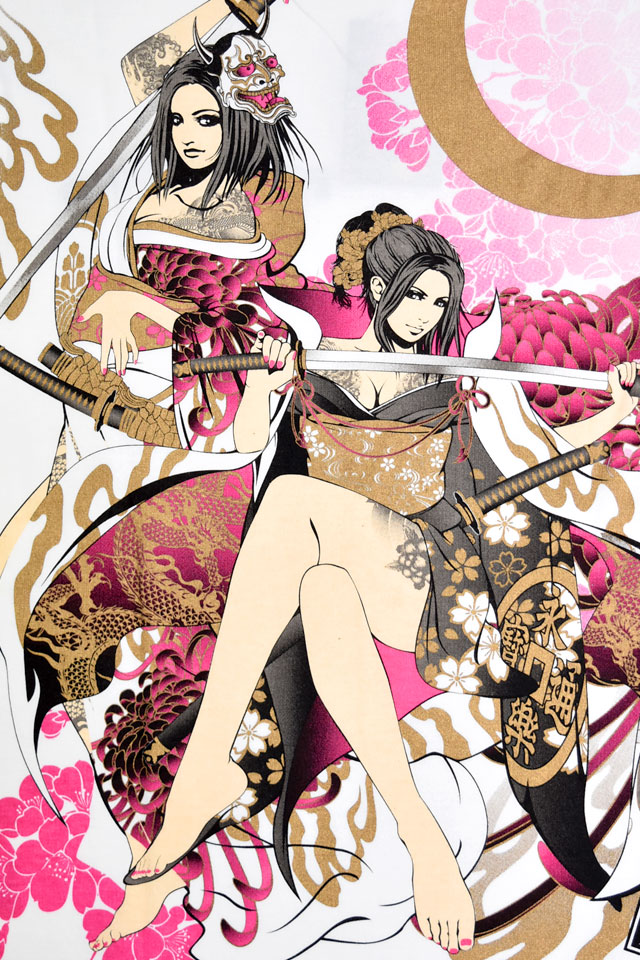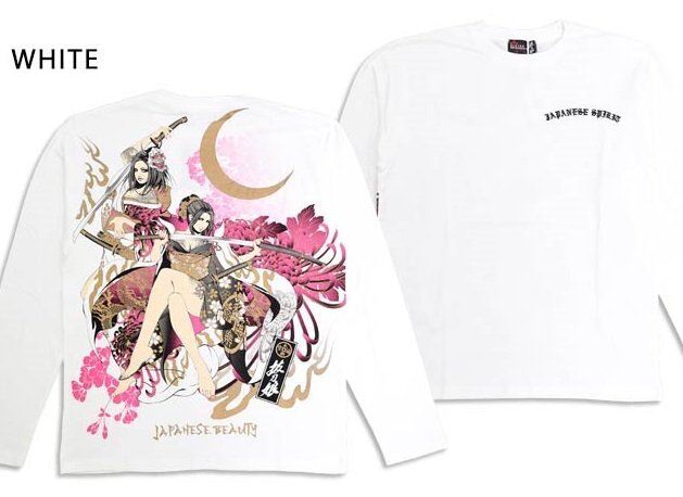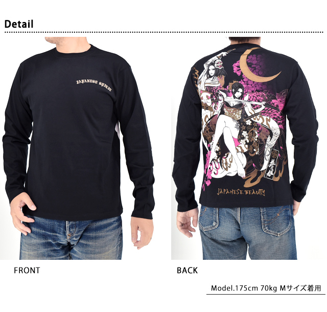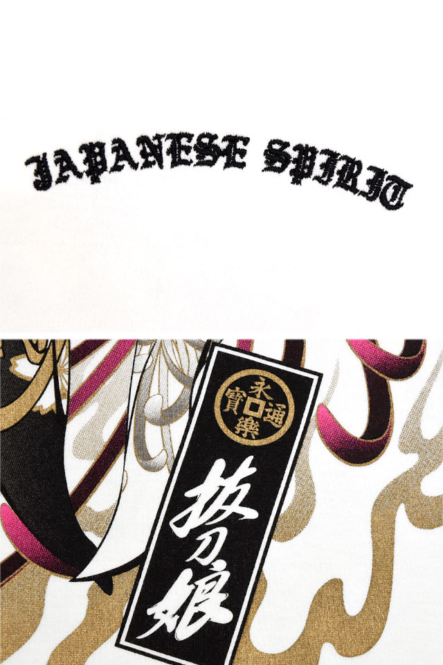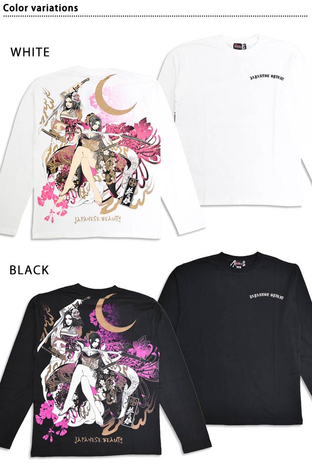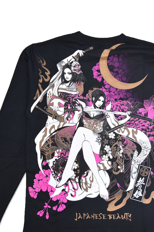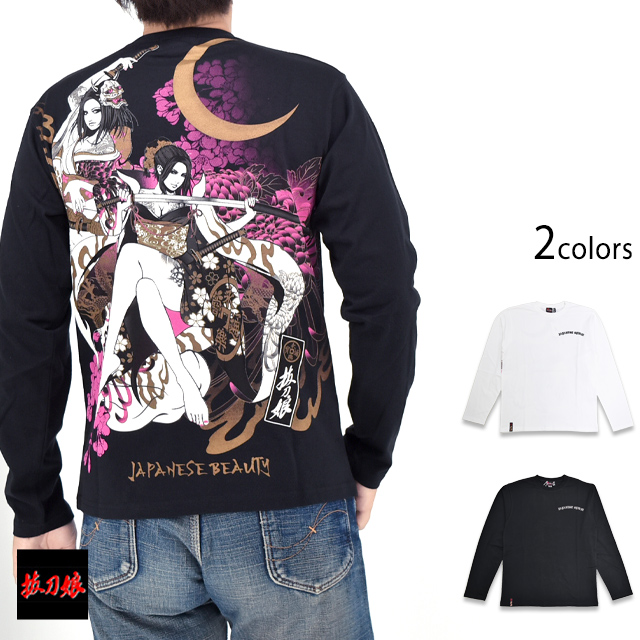 絡繰魂の姉妹ブランドとして誕生した、従来の和柄から抜け出し、和の持つ美しさを融合させた【抜刀娘】から「抜刀娘 華ノ舞ロングTシャツ(253091)」のご紹介です。 背中には刀を構えた二人の娘の美しい姿をダイナミックにプリントしました。 着物や帯の柄まで拘るのが抜刀娘流。 肌蹴た肩や腿には刺青が彫り込まれています。 バックにしっかり柄を入れている分、フロントはシンプルにデザインし、メリハリを付けました。 左胸にはレタードをワンポイントで刺繍しました。 ボディーには、綿100%のさらりとした柔らかなTシャツ生地を使用。 | |||||||||||||||||||||||||