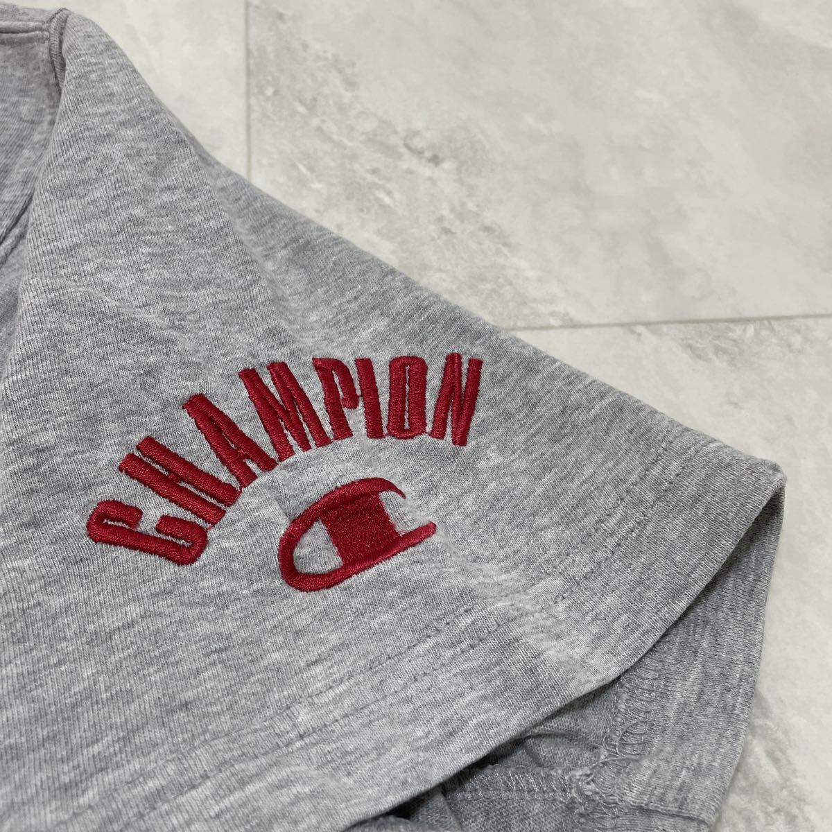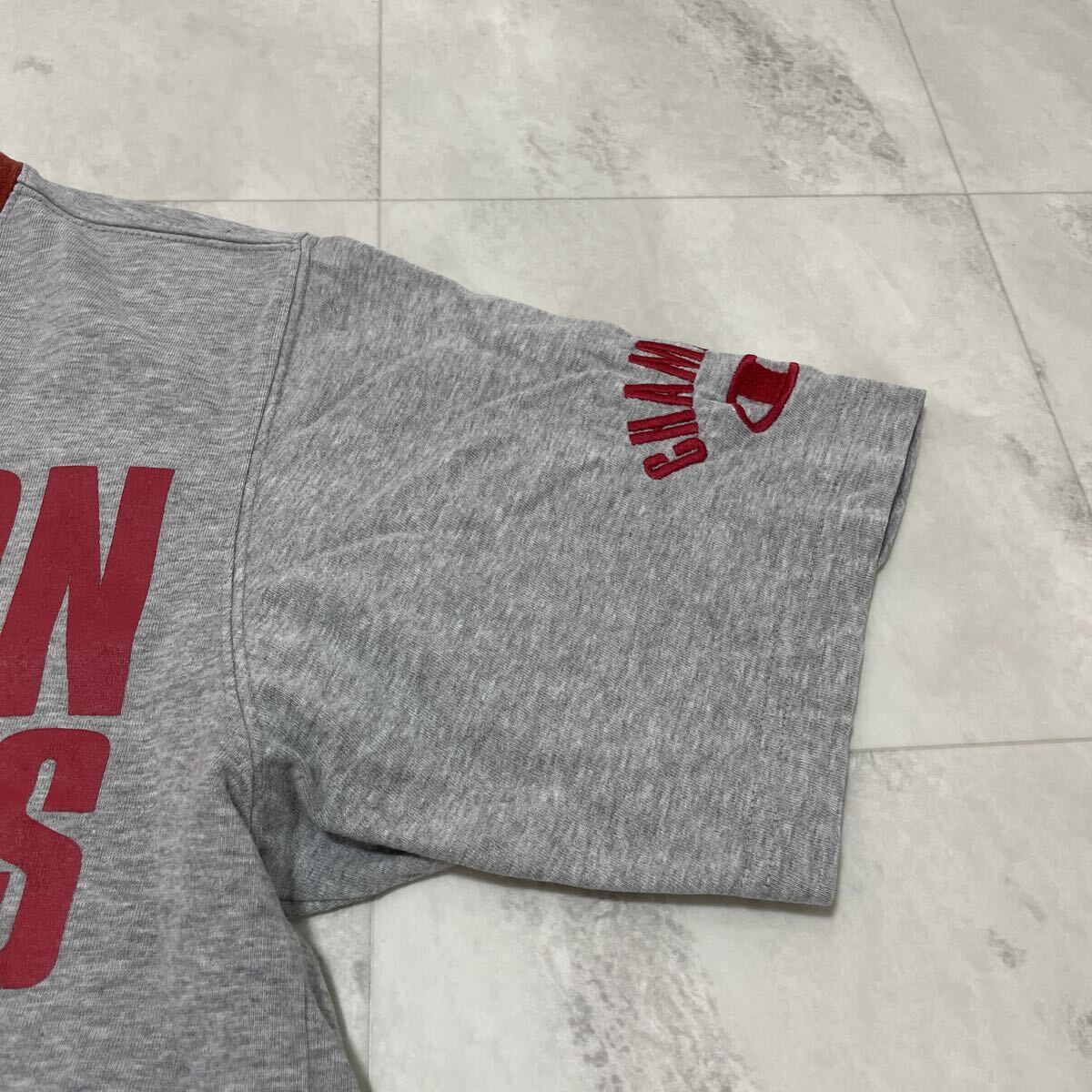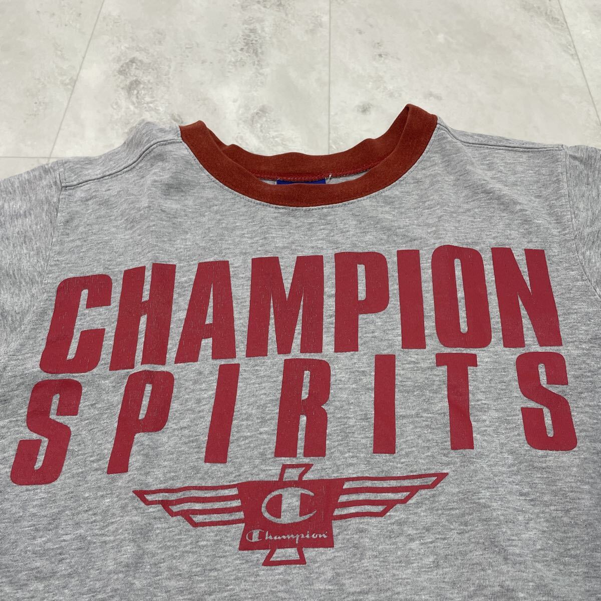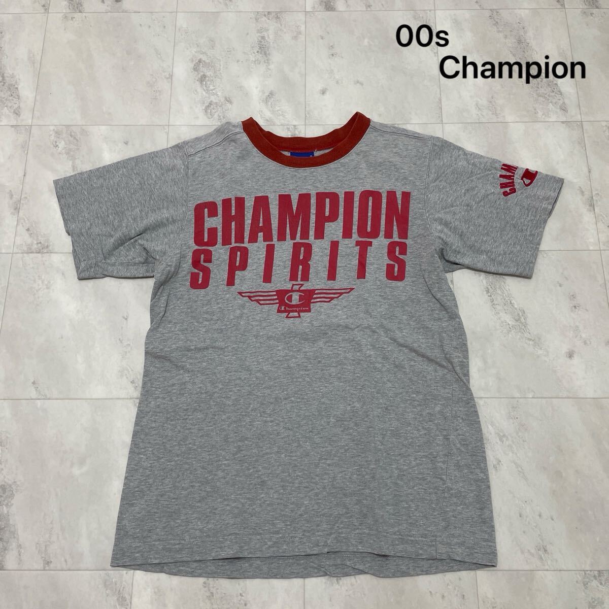 00s Champion チャンピオン Tシャツ 半袖 プリント y2k T-shirt アメカジ リブライン グレー サイズM 玉SS4151