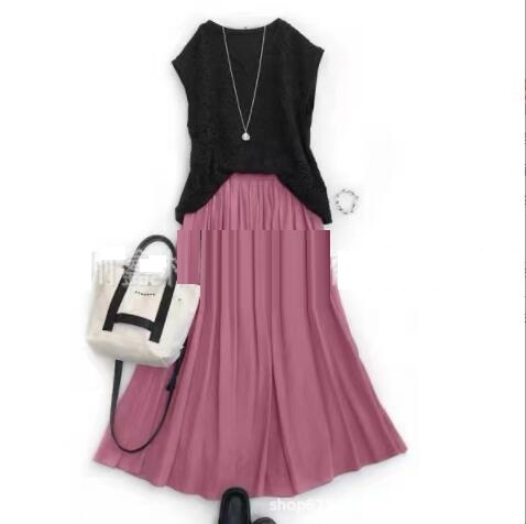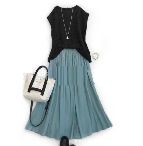 「同梱1万円送料無料」お色選択可黒の高級感あるレースTOPSとしわ加工スカートの2点セット 新品 大きいサイズLサイズ すぐセットアップ