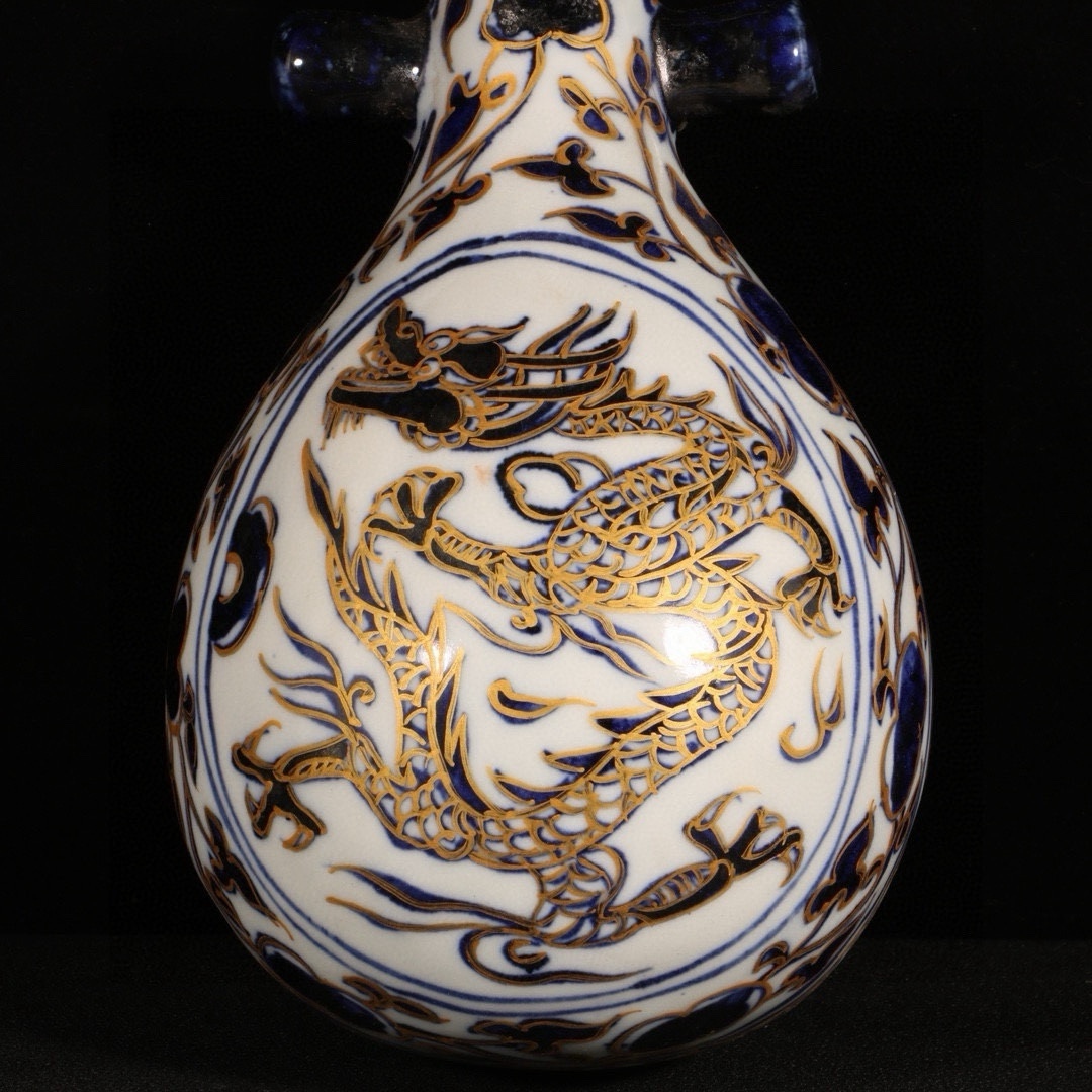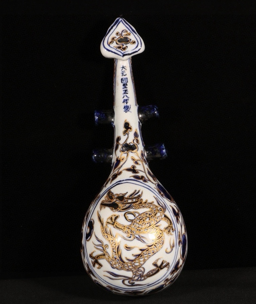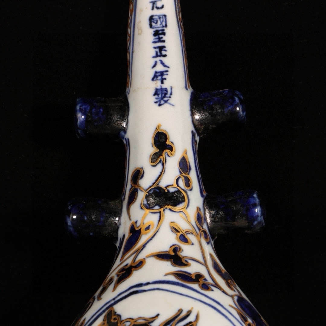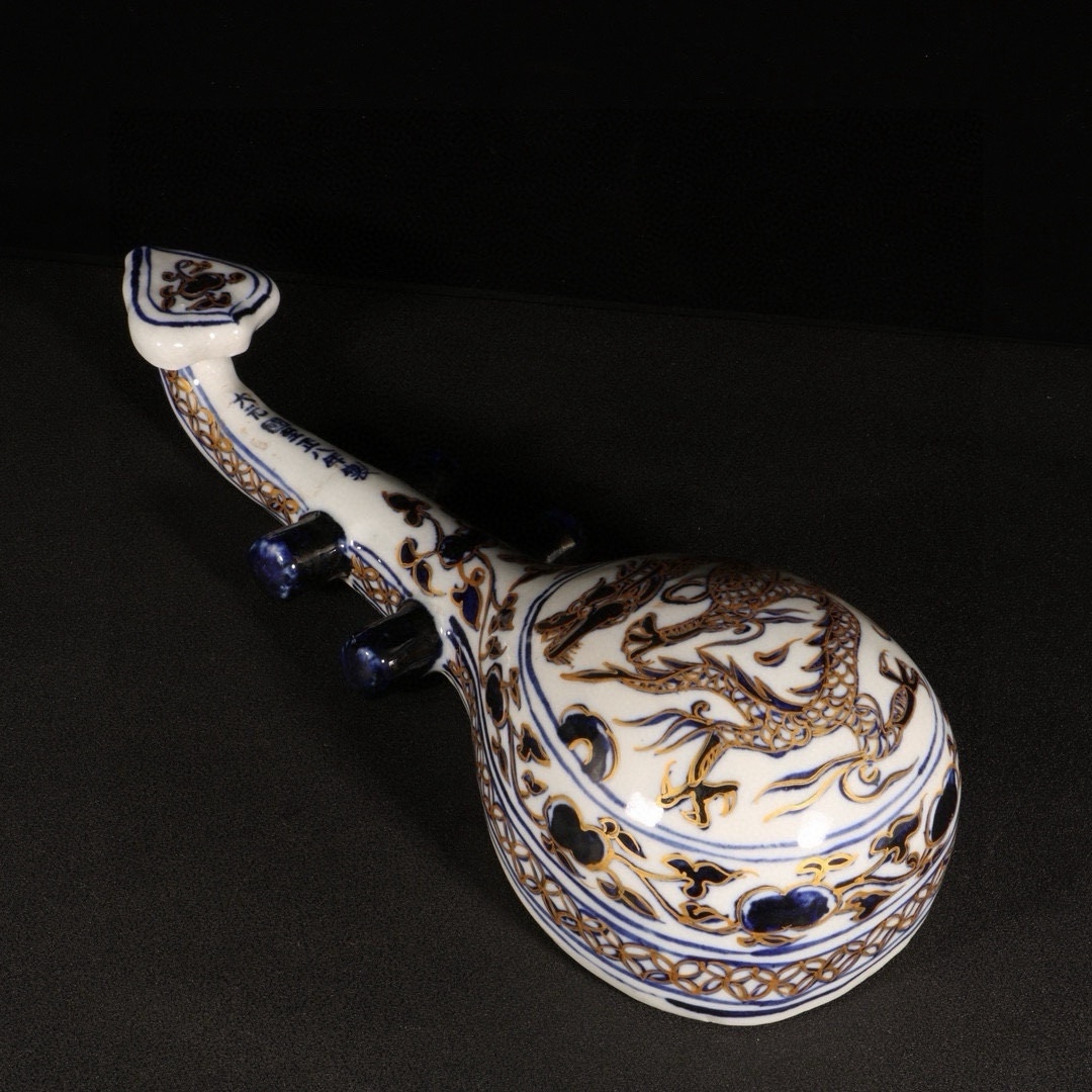 中国元代 青と白に 金竜紋 を描いた琵琶 時代物 陶磁器 中国美術 高さ32 cm 直径12 cm 骨董品 唐物 819