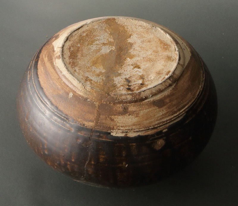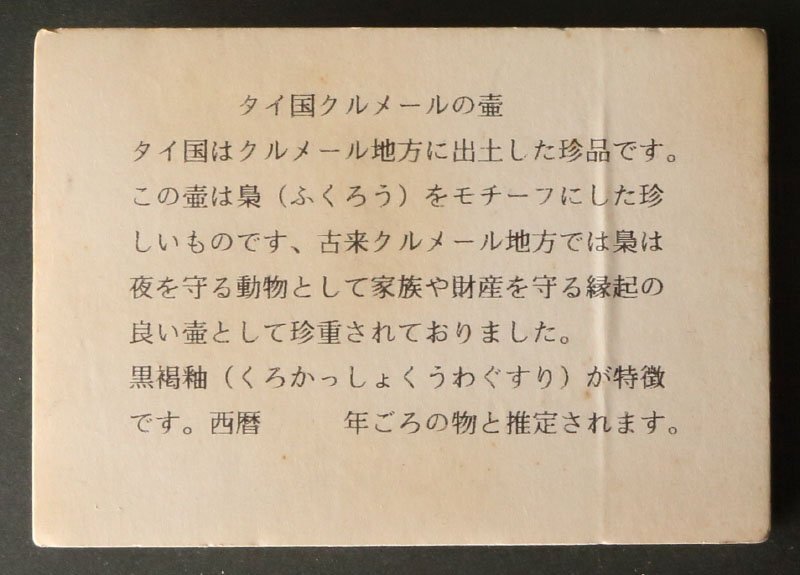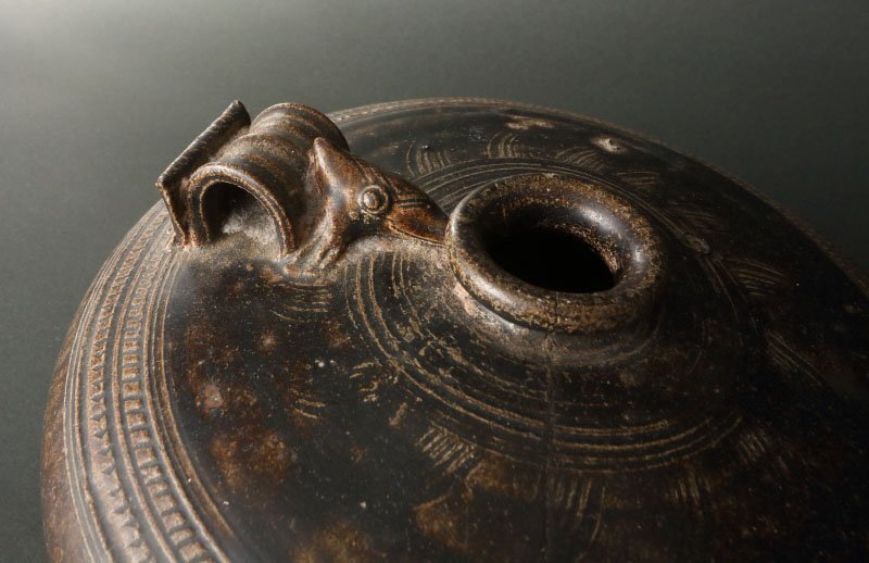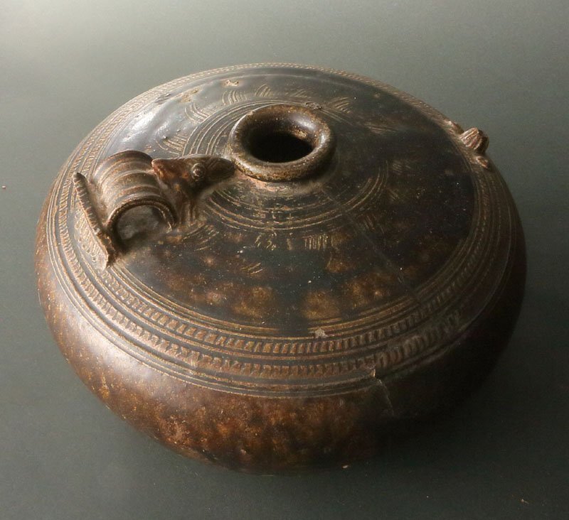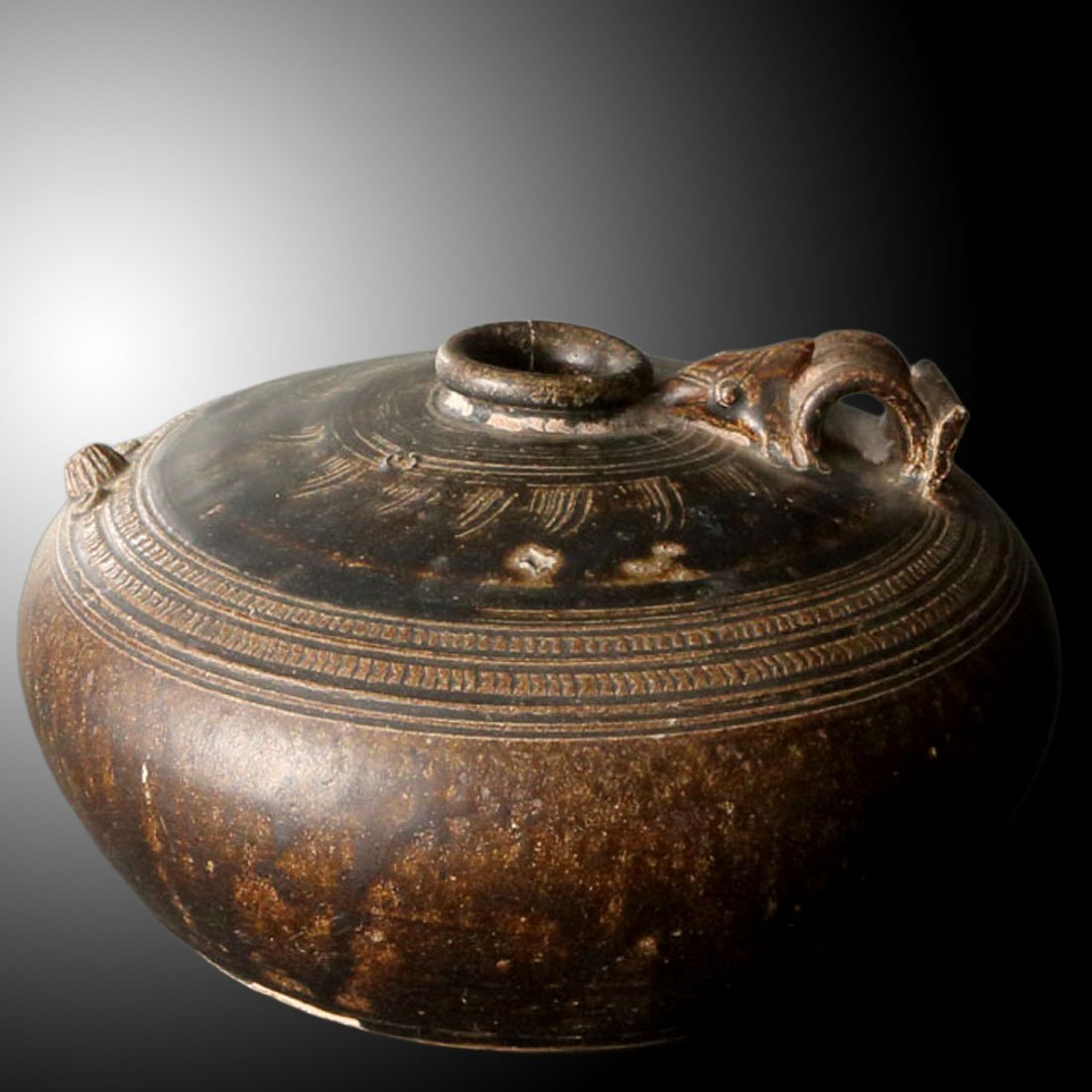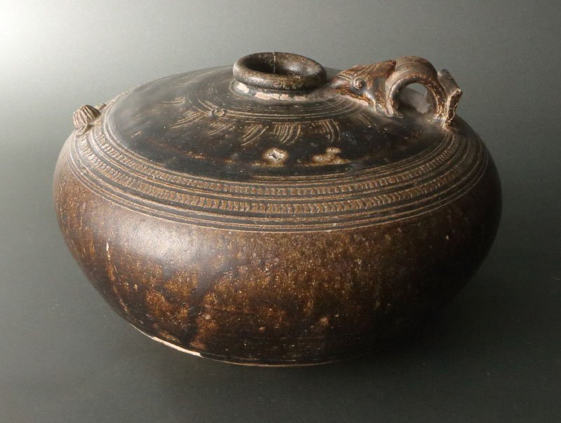 アンコール朝の黒褐釉水注です。 現在のタイ北部・ブリラム窯で焼成されたとみられ、神鳥ガルダを象った把手と日輪や法輪を彷彿とさせる円環状の刻文が特色となっております。シヴァ神のリンガ崇拝を反映し、聖水器として用いられたものと見られます。 アンコール朝ではヒンドゥー教信仰が隆盛を極め、シェムリアップ川がガンジス、環濠に囲まれたバイヨン寺院がメール山に見立てられ、神々とアスラが不死の聖水アムリタを作り出す乳海攪拌の様が寺院のレリーフとして表わされるなど、都城計画にも影響を及ぼしました。ヴィシュヌ神の眷属・ガルダがナーガから聖水を盗む神話も、儀礼として重視されていたと考えられます。 アンコール朝治下のロッブリー地方でも、様々な川がガンジスに見立てられ、同じくメール山に見立てられた寺院群で乳海攪拌が演じられてきたのでしょう。大環濠がもたらす豊穣に支えられた、クメール文化の栄光を宿した逸品です。 寸法:高さ14cm、幅24.5cm、口径4.5cm(最大幅。若干の誤差はご了承下さい) 状態:経年感、複数アタリ、ニュウ、大直しがございます。 |