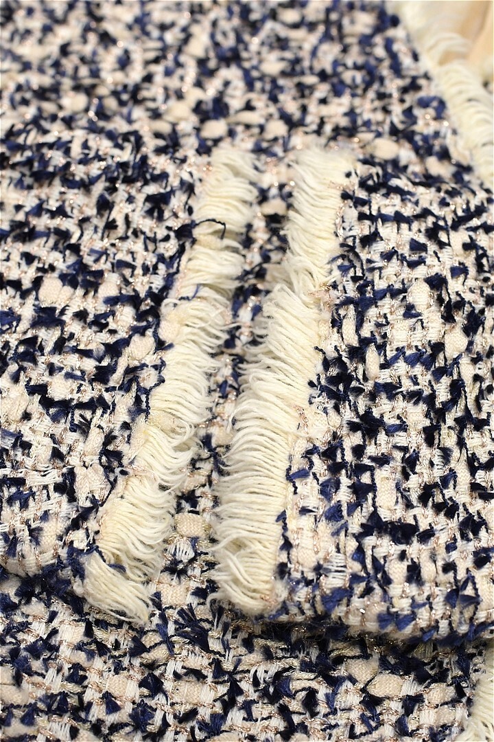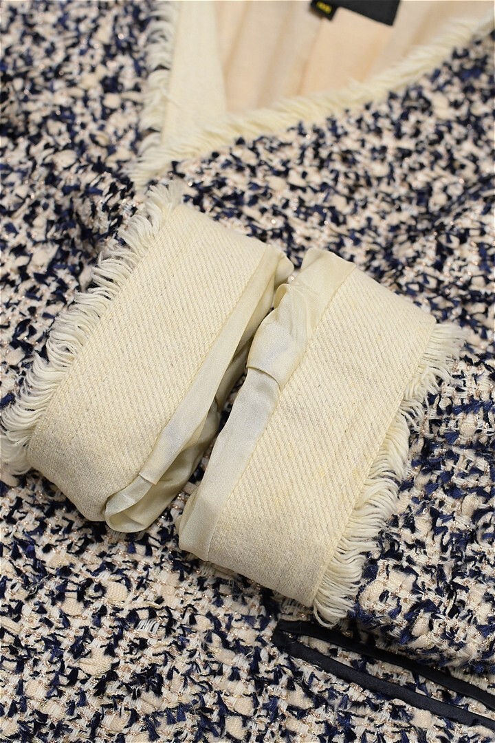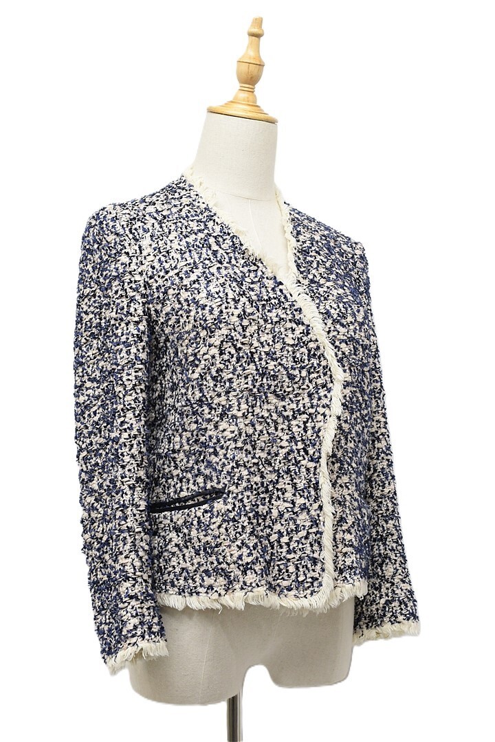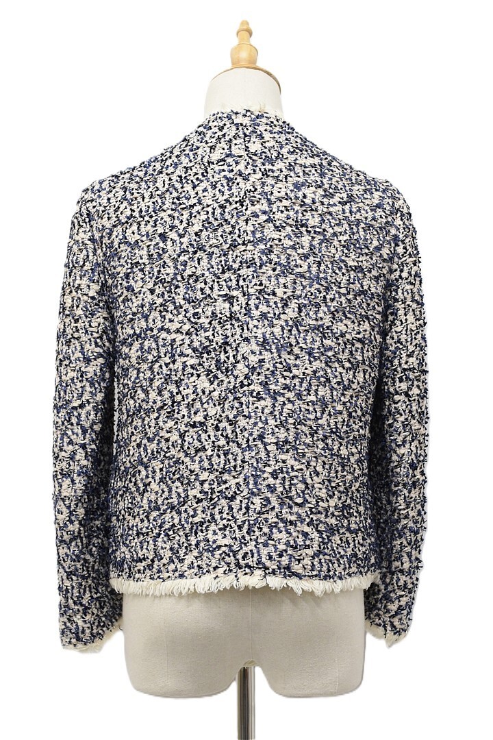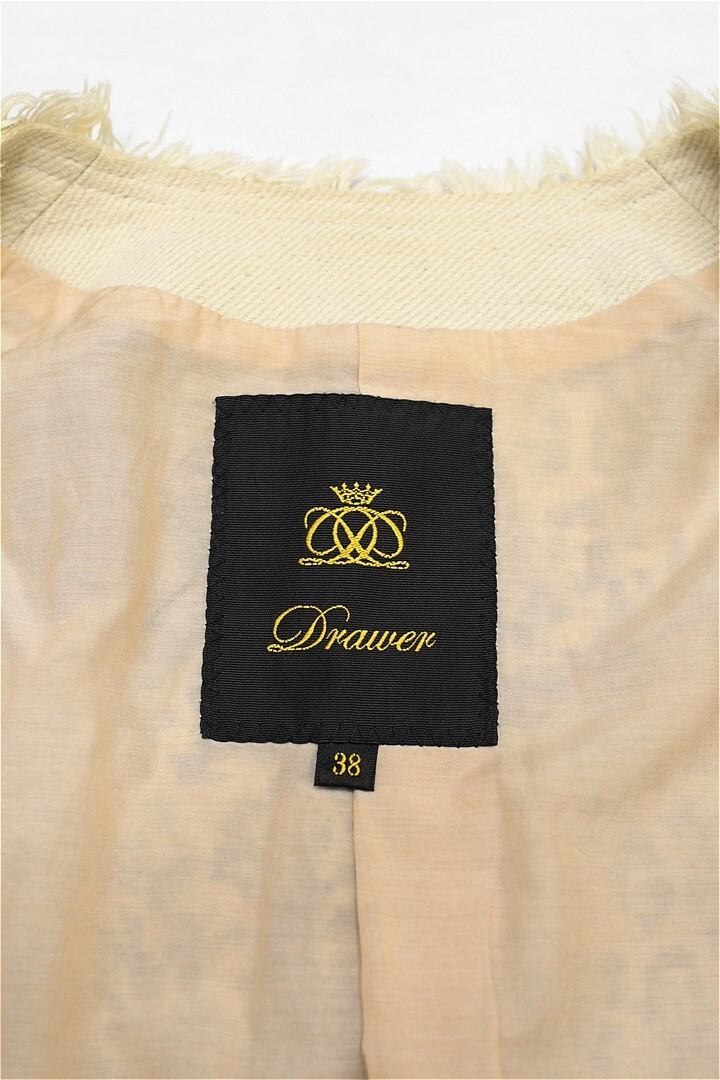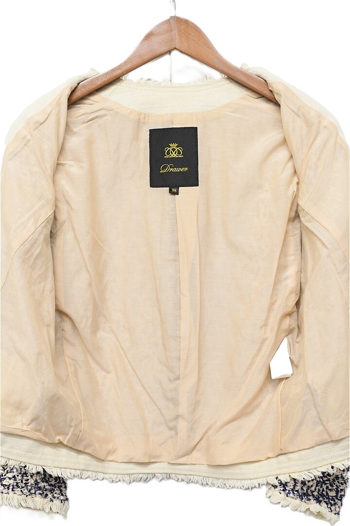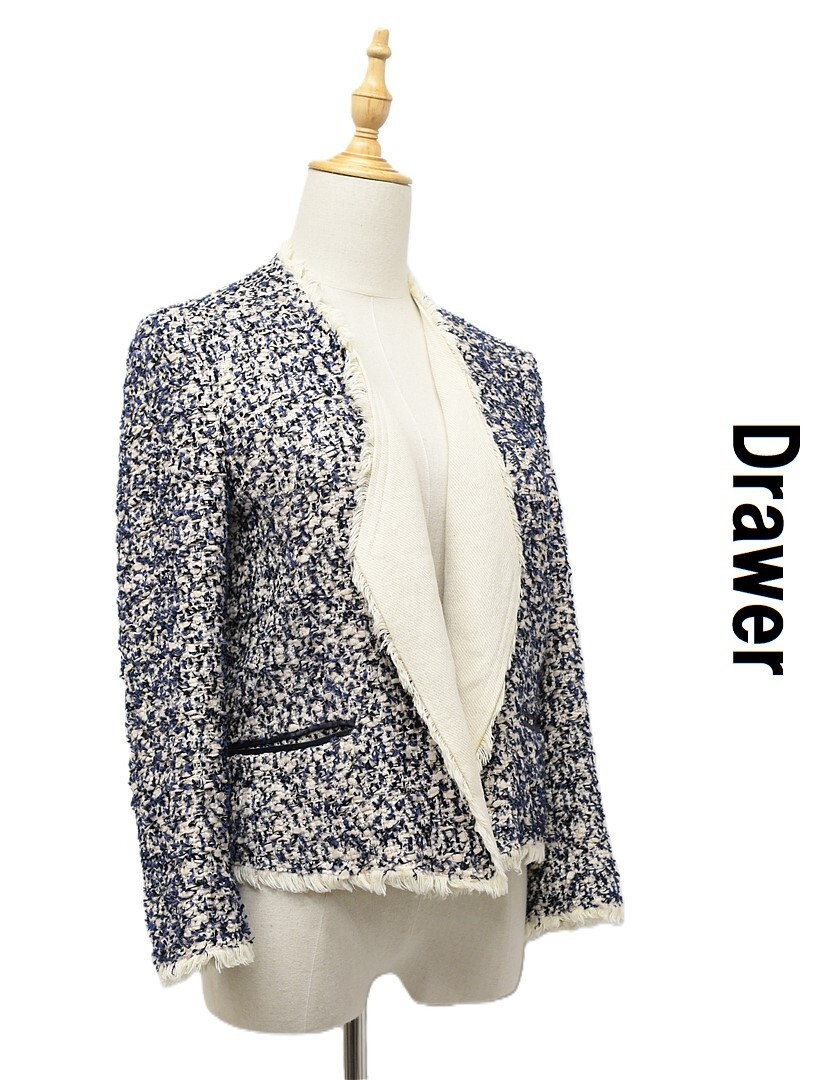E518/Drawer ツイードノーカラージャケット 総裏 ラメ フリンジ 38 M 紺 ベージュ 日本製