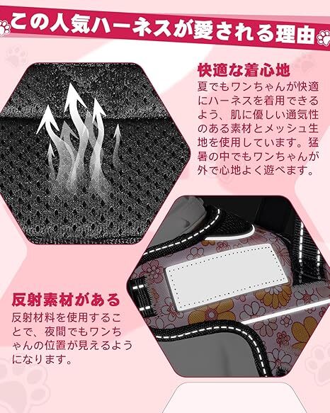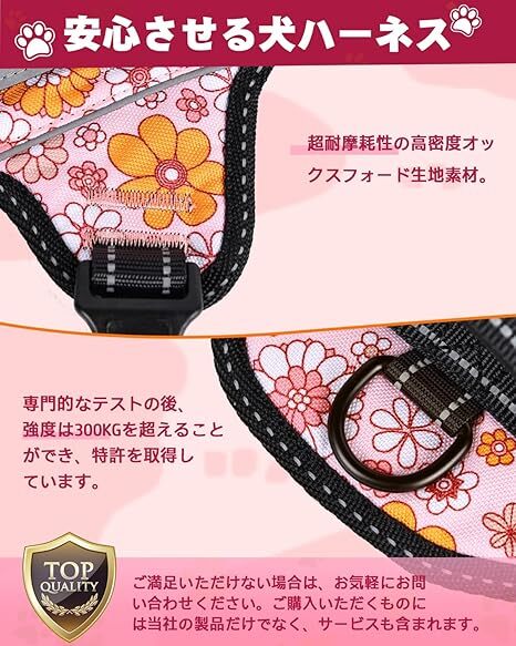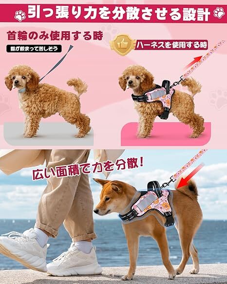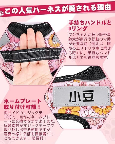 mj-H219★【日本企画犬ハーネス】 犬用胴輪 小型犬/中型犬/大型犬ハーネス 暑さ対策 喉に優しい おしゃれな色 通気性 負担がない ネームプレート (ピンクフラワー、S)