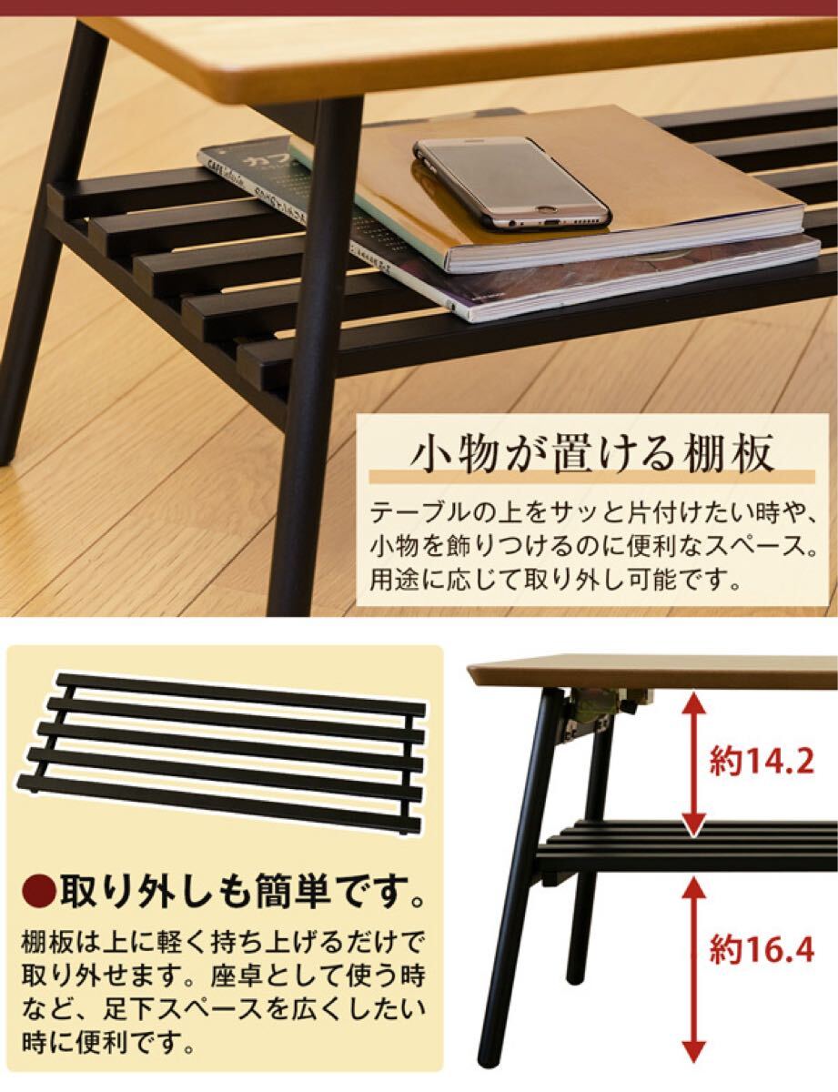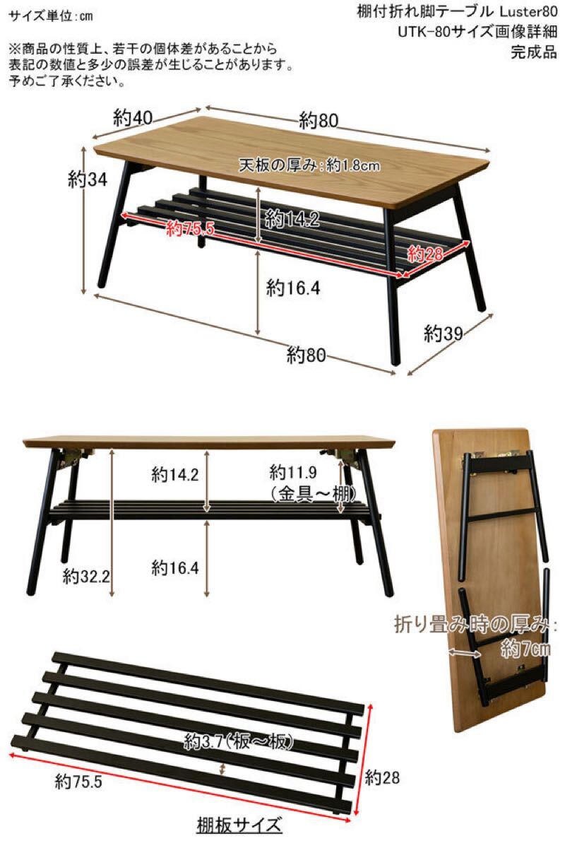 | 商品説明 | 棚付き折れ脚テーブル Luster 80です 木製天板とスチール脚のおしゃれなテーブルです 棚板は取り外して使用可能です(載せているだけです) 脚はレバー操作で簡単に折りたたみ出来ます 折りたたむと約7cmになり、隙間に収納可能です アンティークブラウン(ABR)、オーク(OAK)、ウォールナット(WAL)の3色展開です サイズ・容量 幅800×奥行400×高さ340mm(梱包サイズ:幅880×奥行445×高さ110mm) 天板厚:約18mm 天板耐荷重:約20kg 棚板サイズ:幅755×奥行280mm 棚板耐荷重:約5kg 本体重量:7.3kg(梱包重量:8.1kg) 完成品(1個口) 規格 天板:天然木化粧繊維板 /(ABR)合成樹脂化粧繊維板、PVC貼り、(OAK)オーク突き板、ラッカー塗装・(WAL)ウォールナット突き板、ラッカー塗装 フレーム、棚:スチール(エポキシ粉体塗装) |