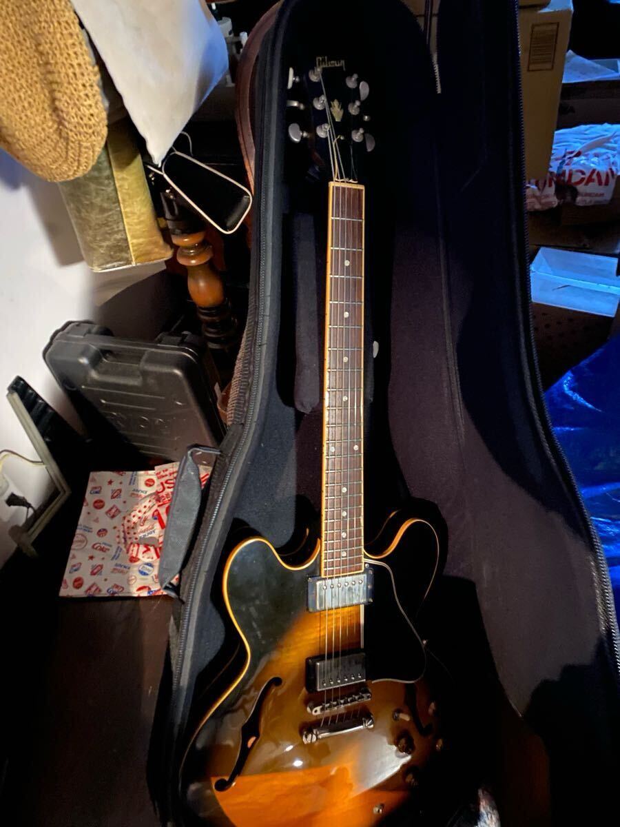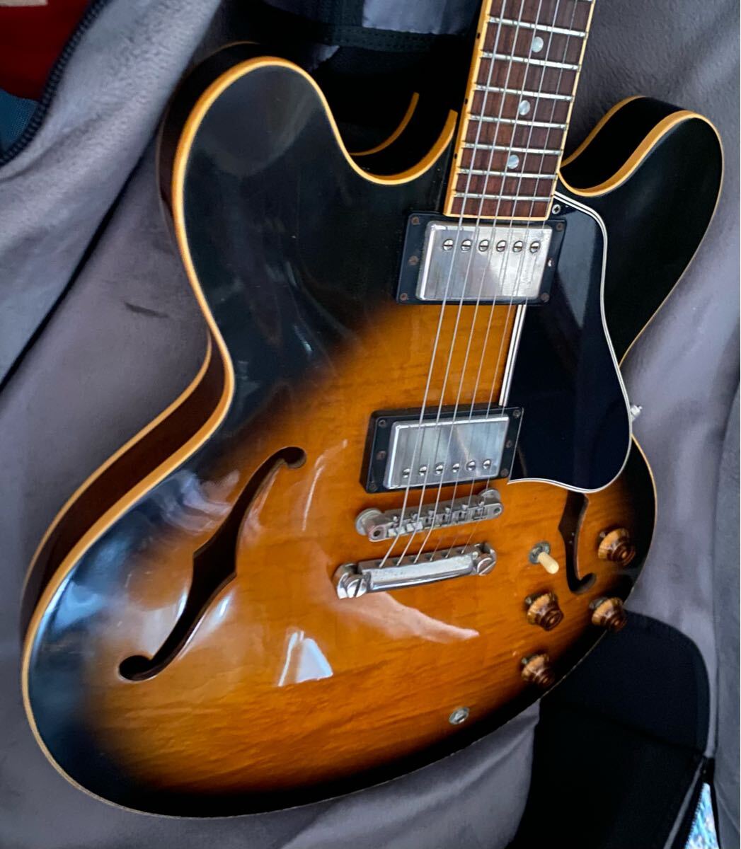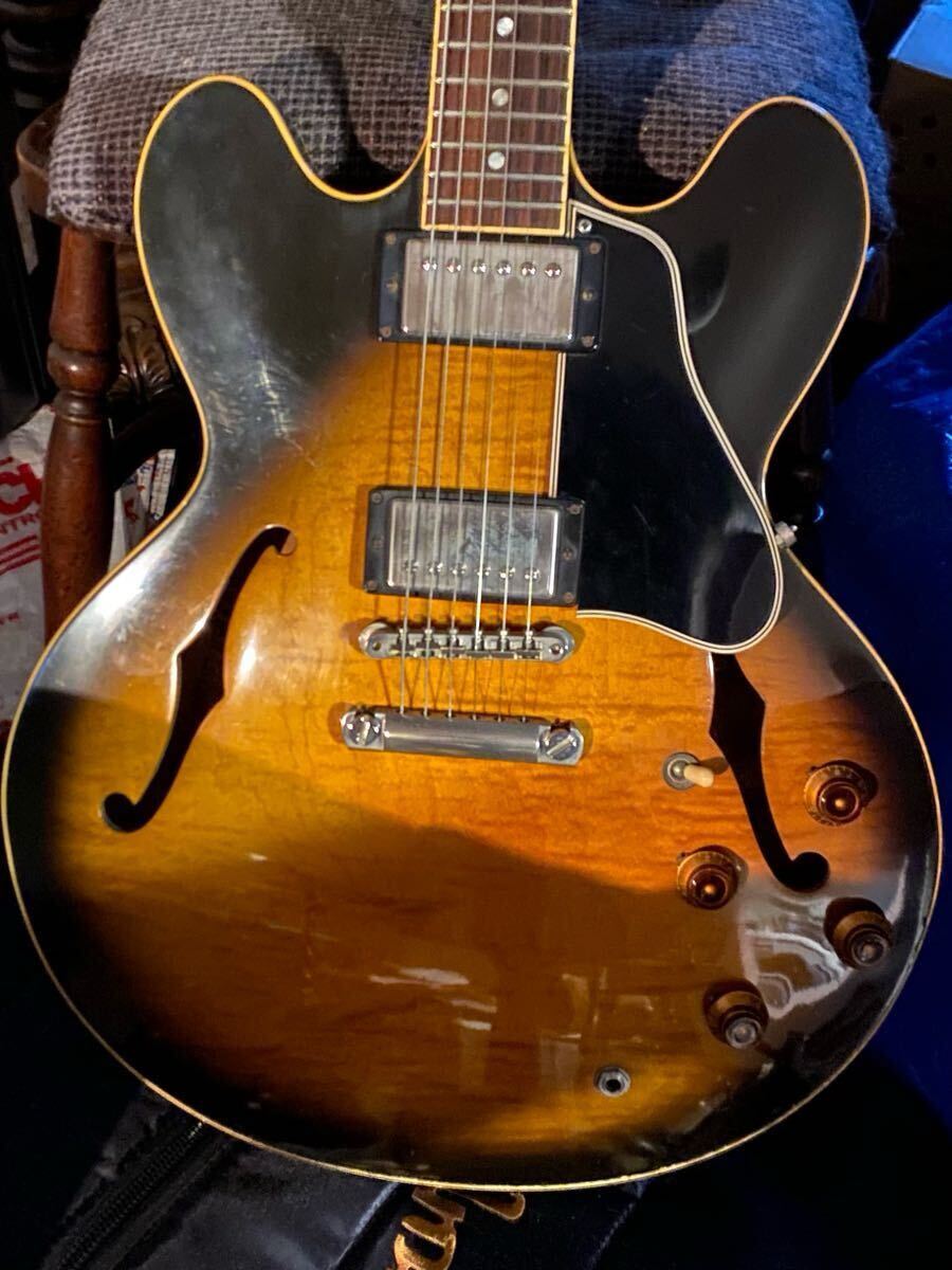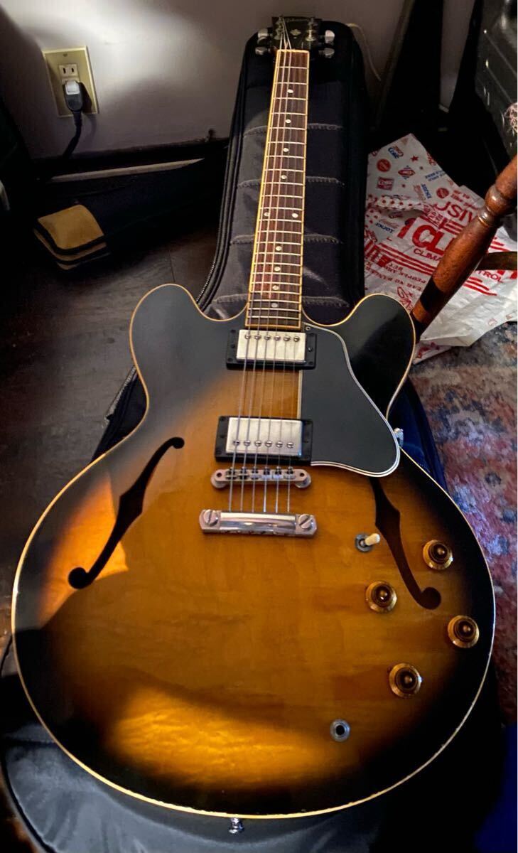 1997年製の335です。ボディは綺麗で少し控えめのフィギュアドメイプルです!フレットは6~7分以上有ります。重量3,9kg、現在ROTOSONDの010~046セットでネック真っ直ぐ弦高は低めでビビる個所は有りません。トラスロッド左右に回ります。修理跡は有りません。年代相応のキズやダゴン、色褪せ有りますが、それなり良い風格だと思います。年齢的に3.9kgが重く感じてくるようになり出品いたします。ケースはGibsonのギグバックになります。