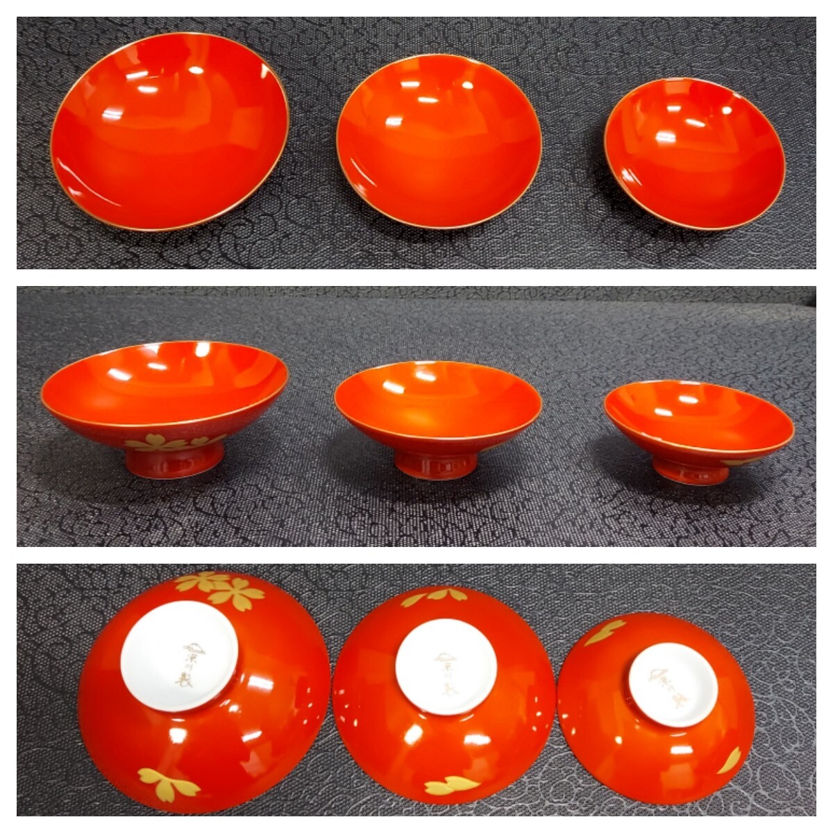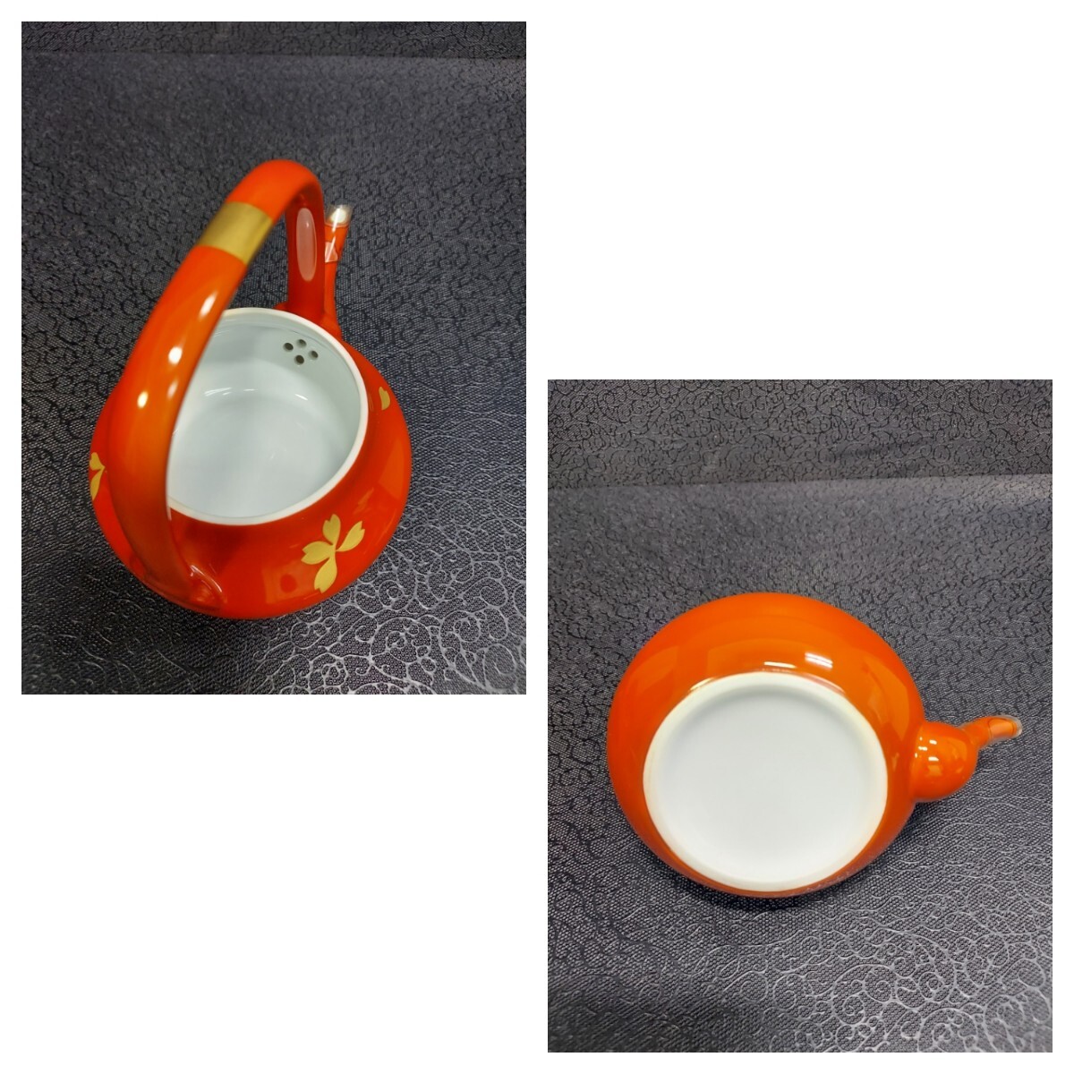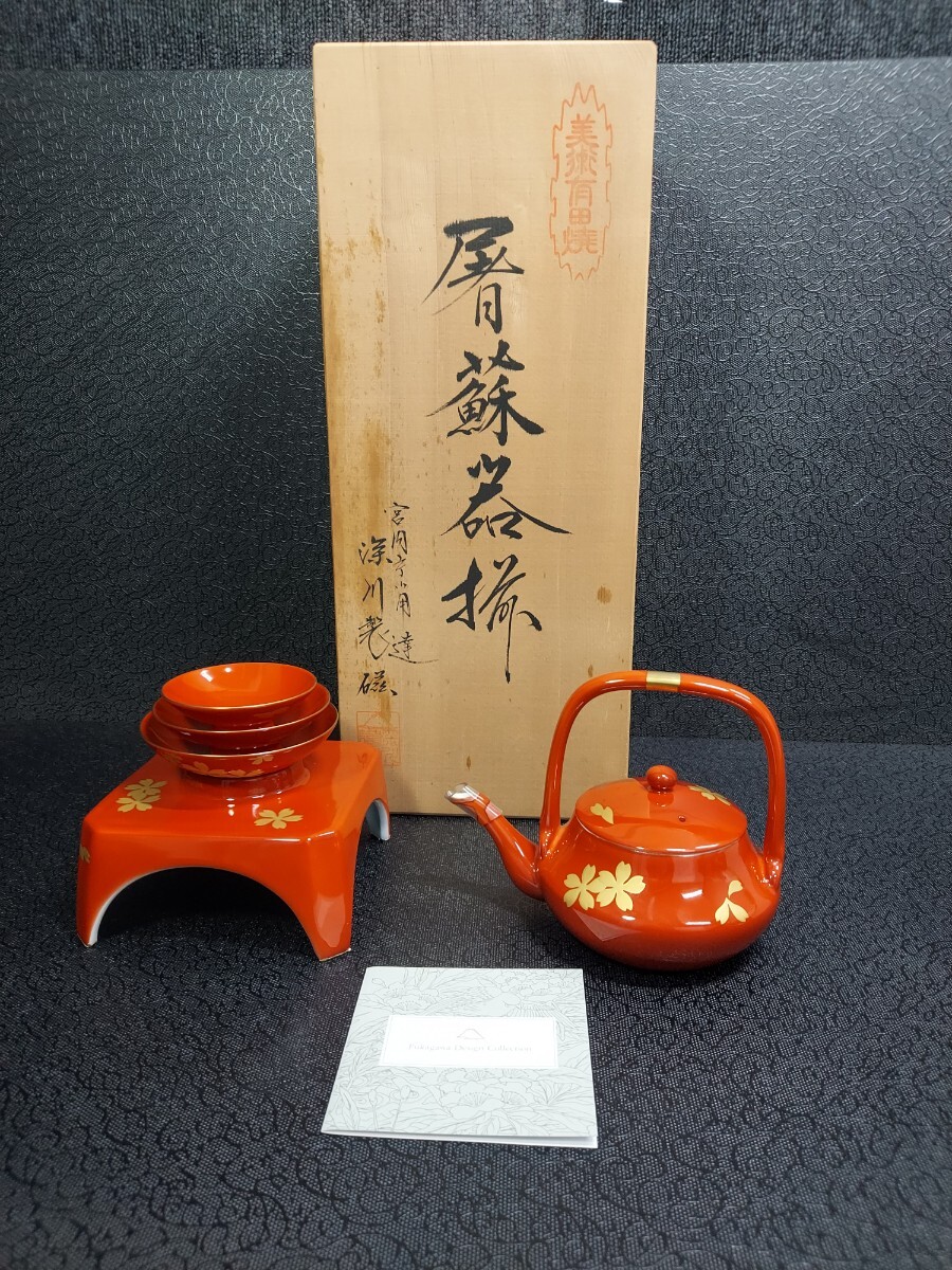 | ★送料最下部に記載★ 宮内庁御用達 深川製磁 朱金彩桜文 屠蘇器揃え 祝い酒 お屠蘇 お正月 酒器 盃杯 銚子 盃台 共箱 | ||||||||
