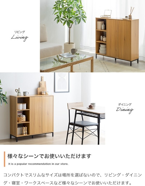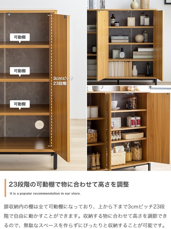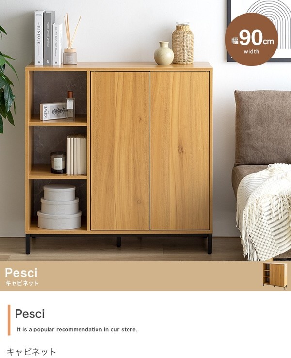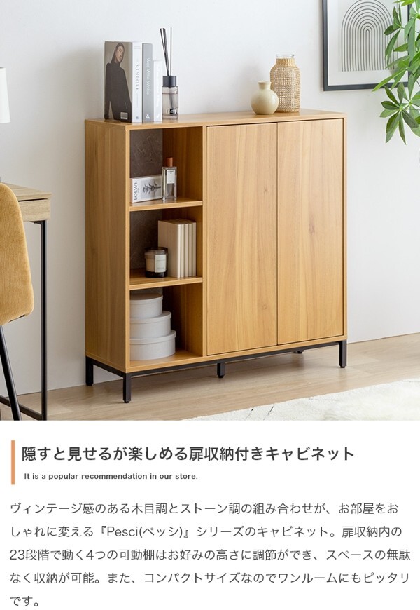 ヴィンテージ感のある木目調とストーン調の組み合わせが、お部屋をおしゃれに演出する『Pesci(ペッシ)』シリーズのキャビネット。 扉収納内の23段階で動く4つの可動棚はお好みの高さに調節ができ、スペースの無駄なく収納することができます。 また、コンパクトで置きやすいサイズ設計なので、一人暮らしやワンルームにお住まいの方にもピッタリです。 配達業者を指定いただくことはできません。 沖縄・離島に関しましては、別途配送料が必要となります。 北海道への配送も別途配送料が必要になる場合がございます。 ※別途送料が発生する場合は後ほどご連絡させていただきます。 タイミングによっては在庫切れの場合があります。