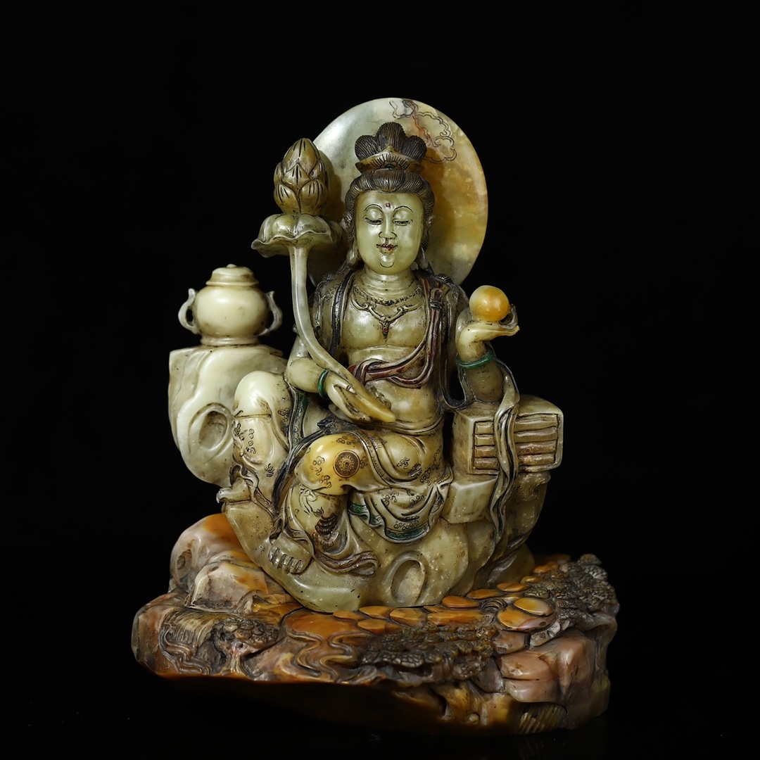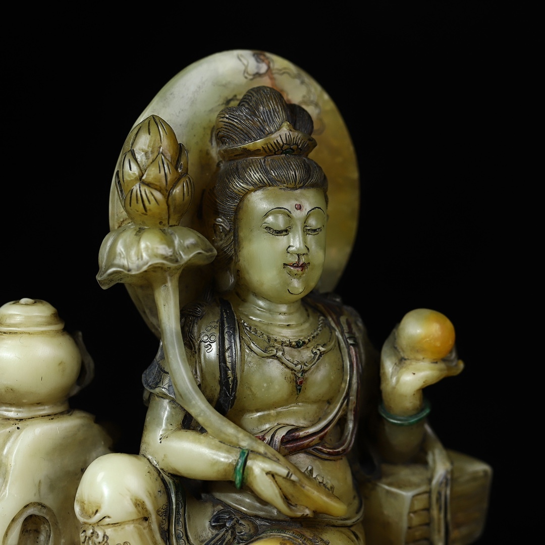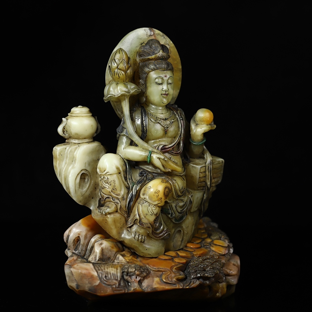 *珍品旧蔵* 【清代篆刻家 董洵】寿山石 彫刻【関音賜福】蓮花觀音 仏像 置物 極細工 中国古玩 骨董品 古美味 H48
