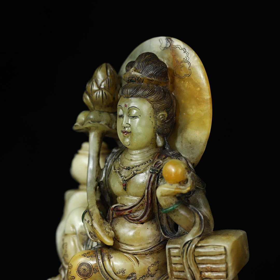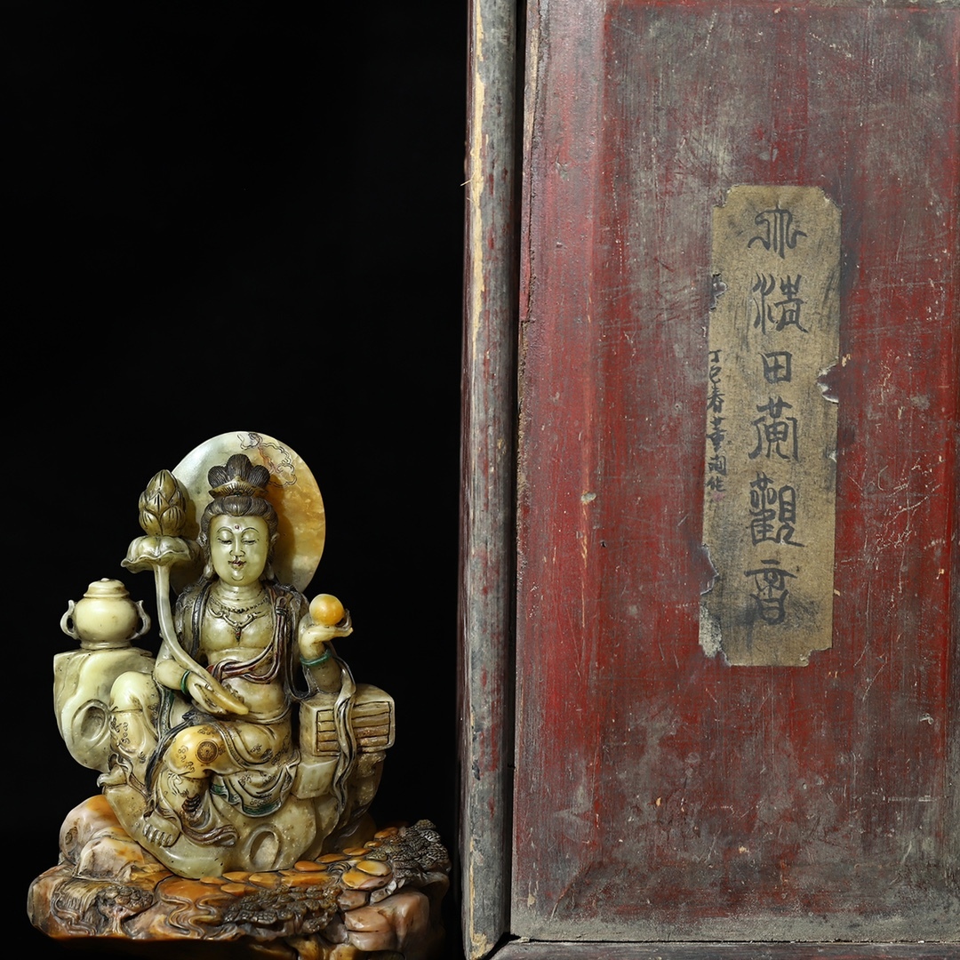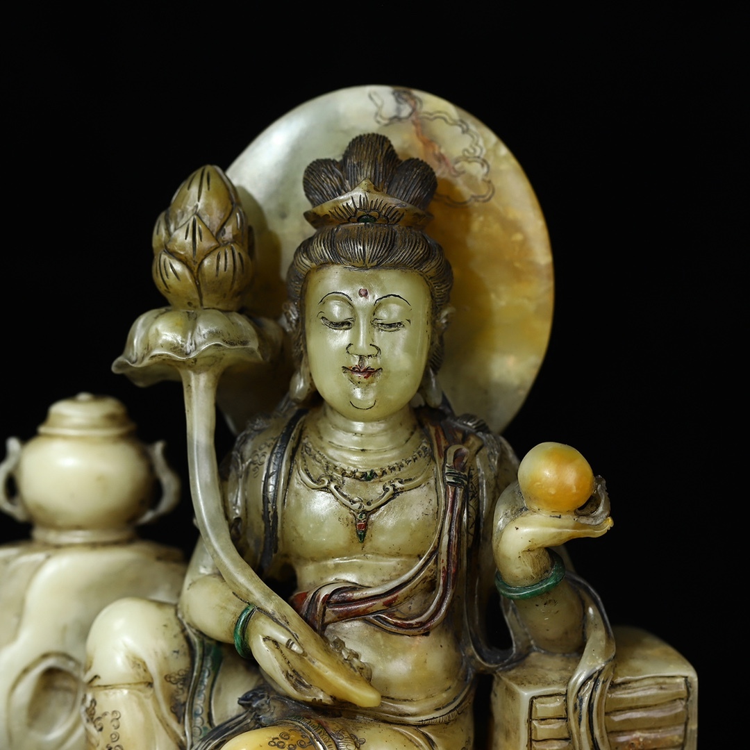 *珍品旧蔵* 【清代篆刻家 董洵】寿山石 彫刻【関音賜福】蓮花觀音 仏像 置物 極細工 中国古玩 骨董品 古美味 H48