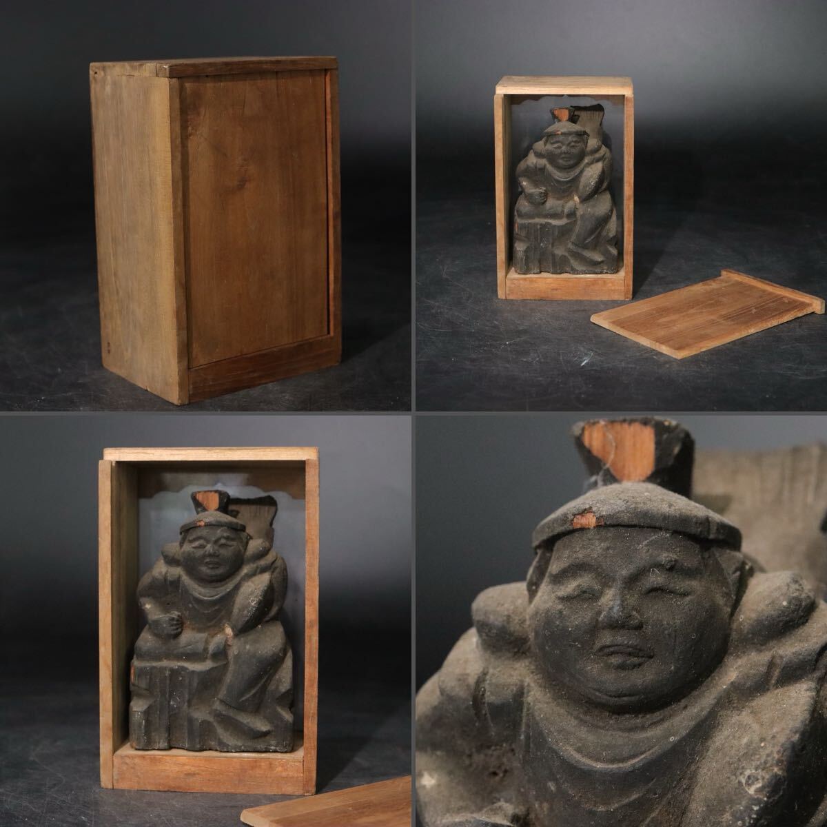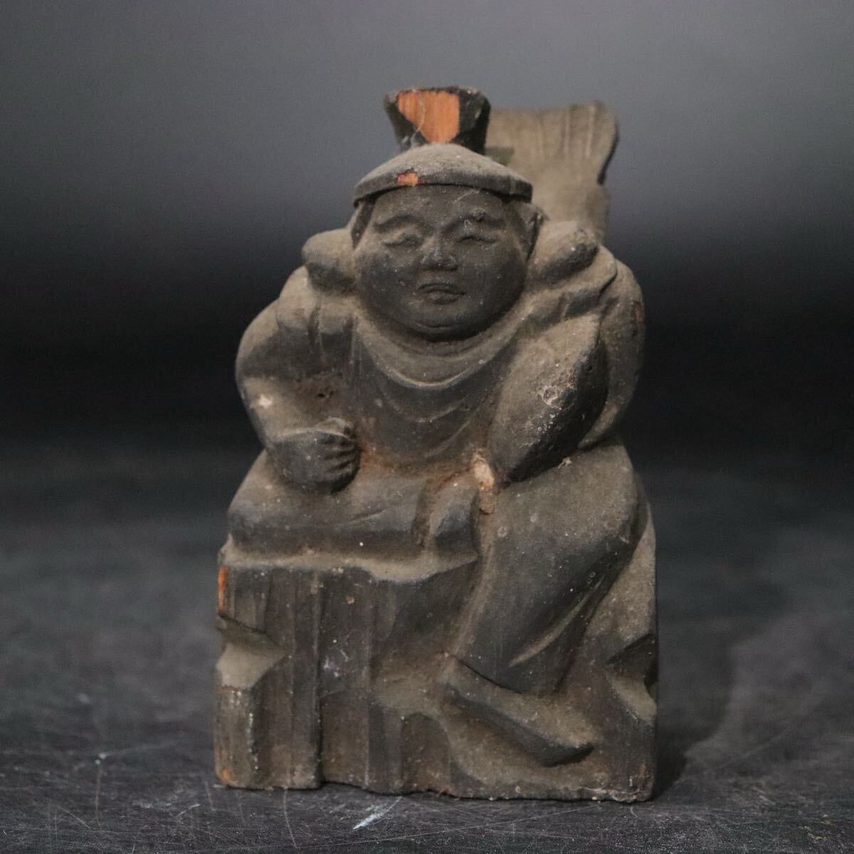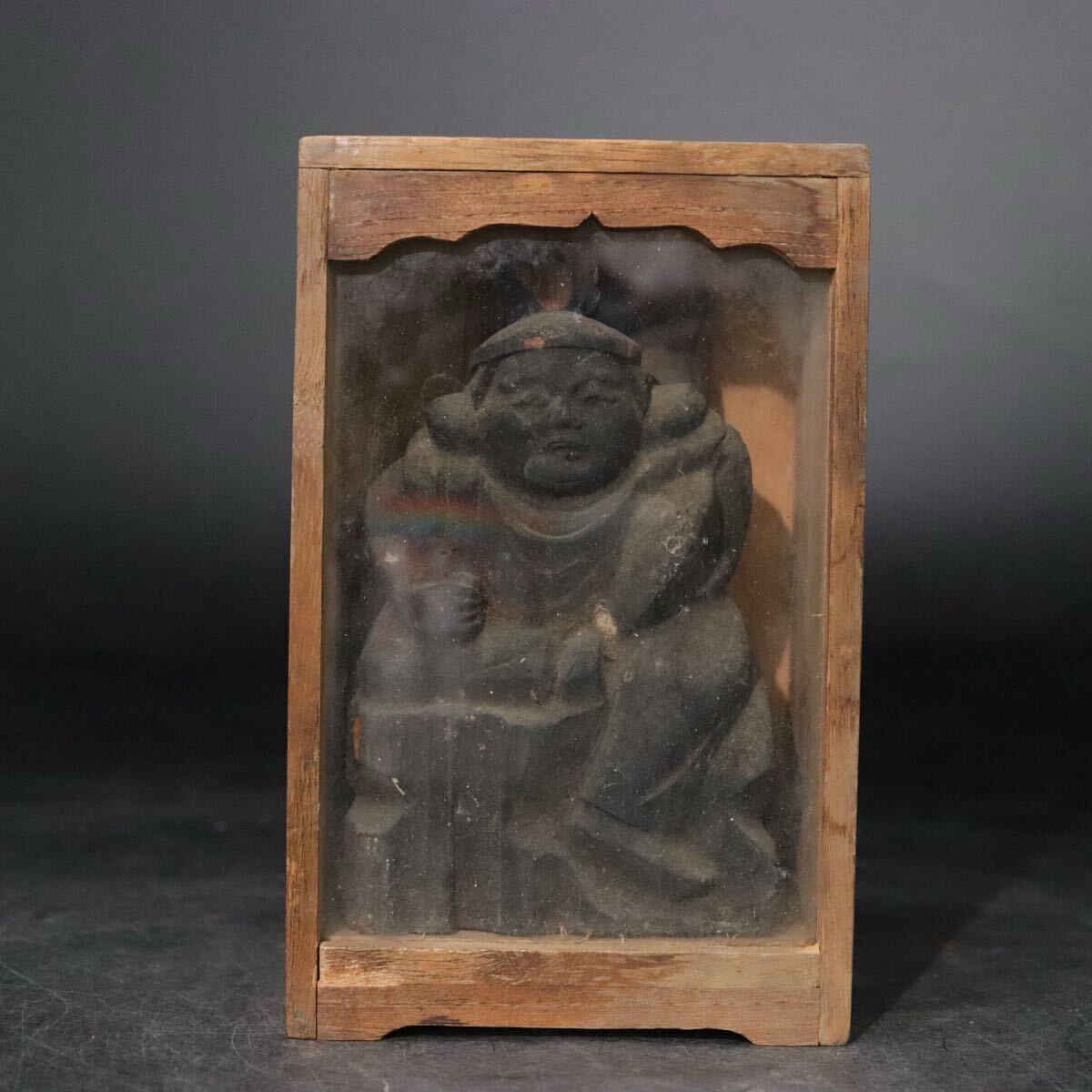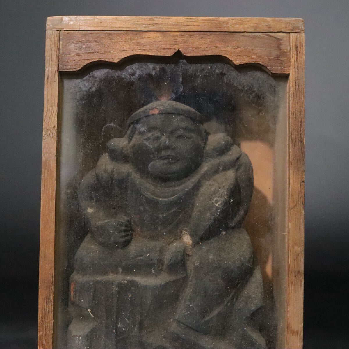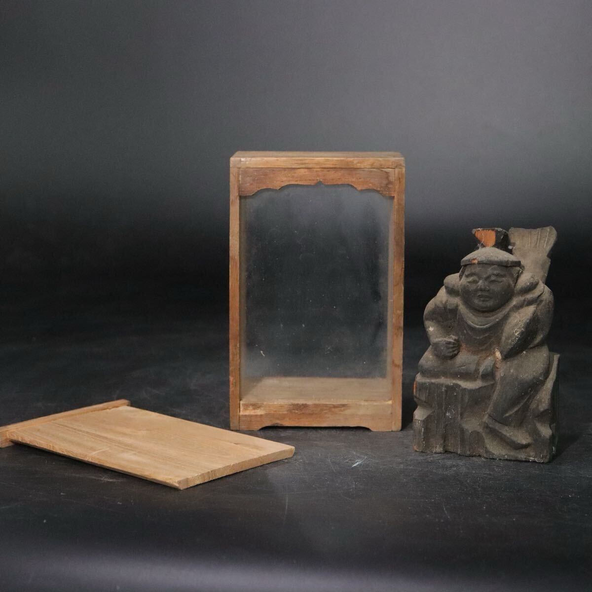 時代 木彫 恵比寿天 像 ガラス板嵌め 箱付 / 民仏 民衆仏 竈神 仏像 天然木置物 .B916 |