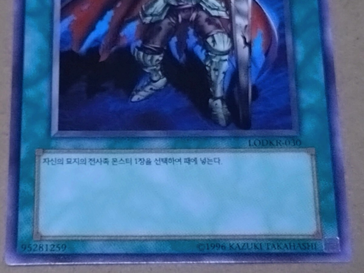 カードの型式番号が通常はパック名‐言語カード番号になるのですがこの戦士の生還はLODKR-030となっており、パック名言語‐カード番号になっています。参考までに写真9に同一弾に収録された正規の型式番号の王宮の弾圧を載せておきます。