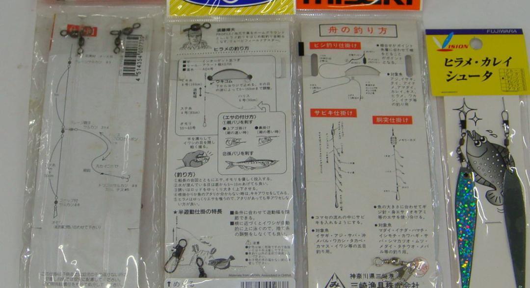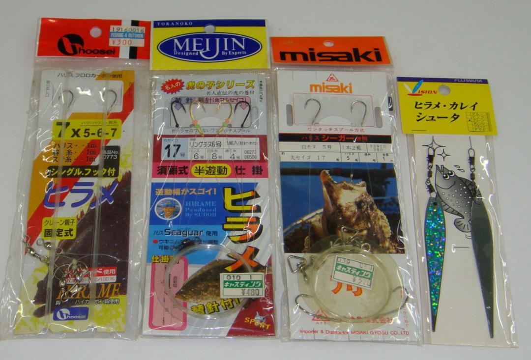 ヒラメ仕掛4種 ヒラメシュータ 4枚セット 中身は新品未使用品と思われますが 時間が経っておりますので 納得の上ご購入ください すべて写真でご確認ください 〇入金後1~3日以内に商品を発送させていただきます 〇ノークレームノーリターンでお願いします ミサキ MEIJIN hoosei ヒラメ マゴチ 泳がせ 仕掛け
