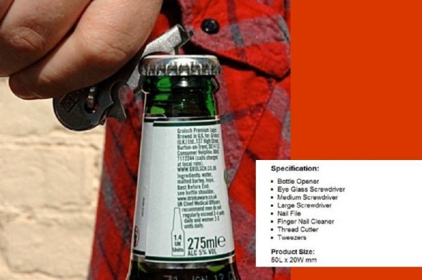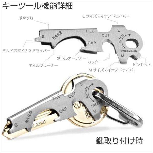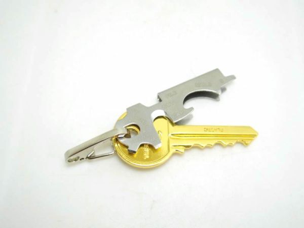 | キーホルダー マルチ多機能ツール 栓抜き、マイナスドライバー、紐などのカッターなど7種類の機能があります。 鍵はつきません。 お使いの鍵とサイズがあえば、置き換えて使えます。 サイズ:2.3cm x 7cm x 0.5cm |