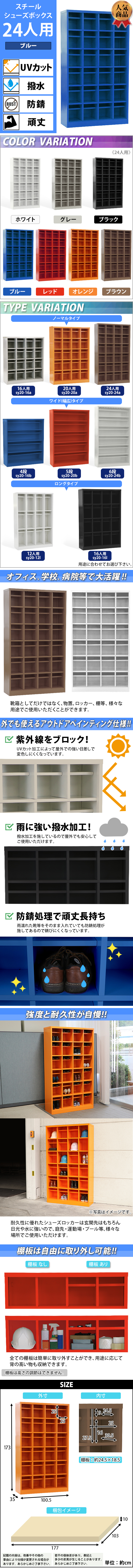 | 商品名 | 送料無料 ロッカー おしゃれ スチール シューズボックス 24人用 ブルー オープンタイプ 棚板付き 扉なし 4列6段 UVカット 撥水 防錆 頑丈 シューズロッカー シューズラック スリム 更衣ロッカー 靴箱 下駄箱 棚 物置 屋外 中棚 運動場 プール sy2024a |