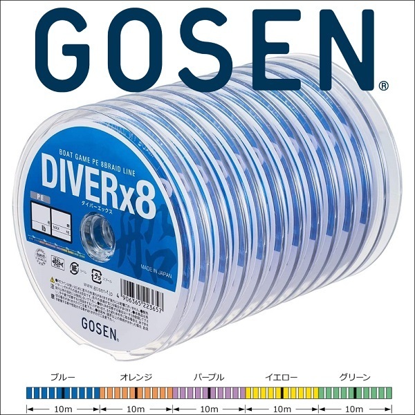 ゴーセン PEダイバーx8 船 8号 95LB 1200m連結 5色分け ダイバーエックス エイト 日本製 国産8本組PEライン
