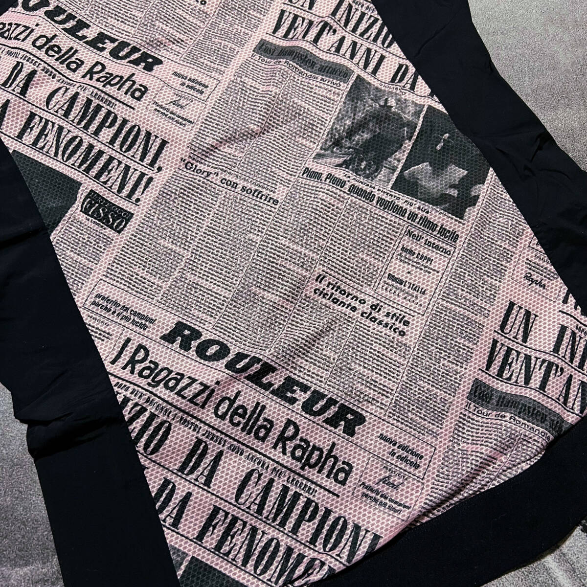 ピンクの新聞紙のデザインは、欧州においてのロードサイクリング関連の偉大な機関のひとつである、ラ・ガゼッタ・デロ・スポルトへのオマージュと言えるでしょう。その昔、この象徴的な新聞はレースの詳細やリザルトを載せたりするだけでなく、創意工夫あふれるライダーたちによって、下り坂で肌寒さを感じた時に保温性を高めるためにジャージの内側に詰めたり...と、まざまな用途に使われていました。