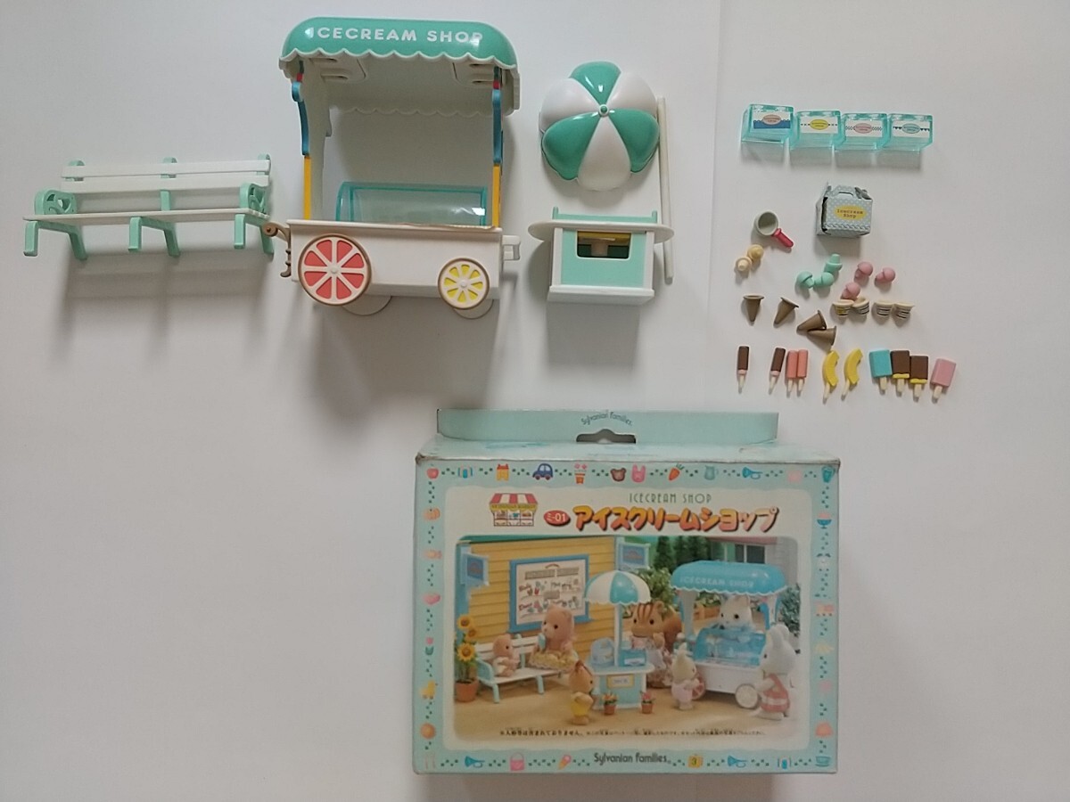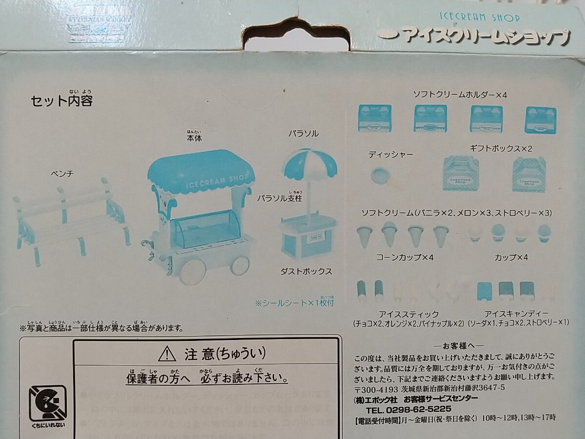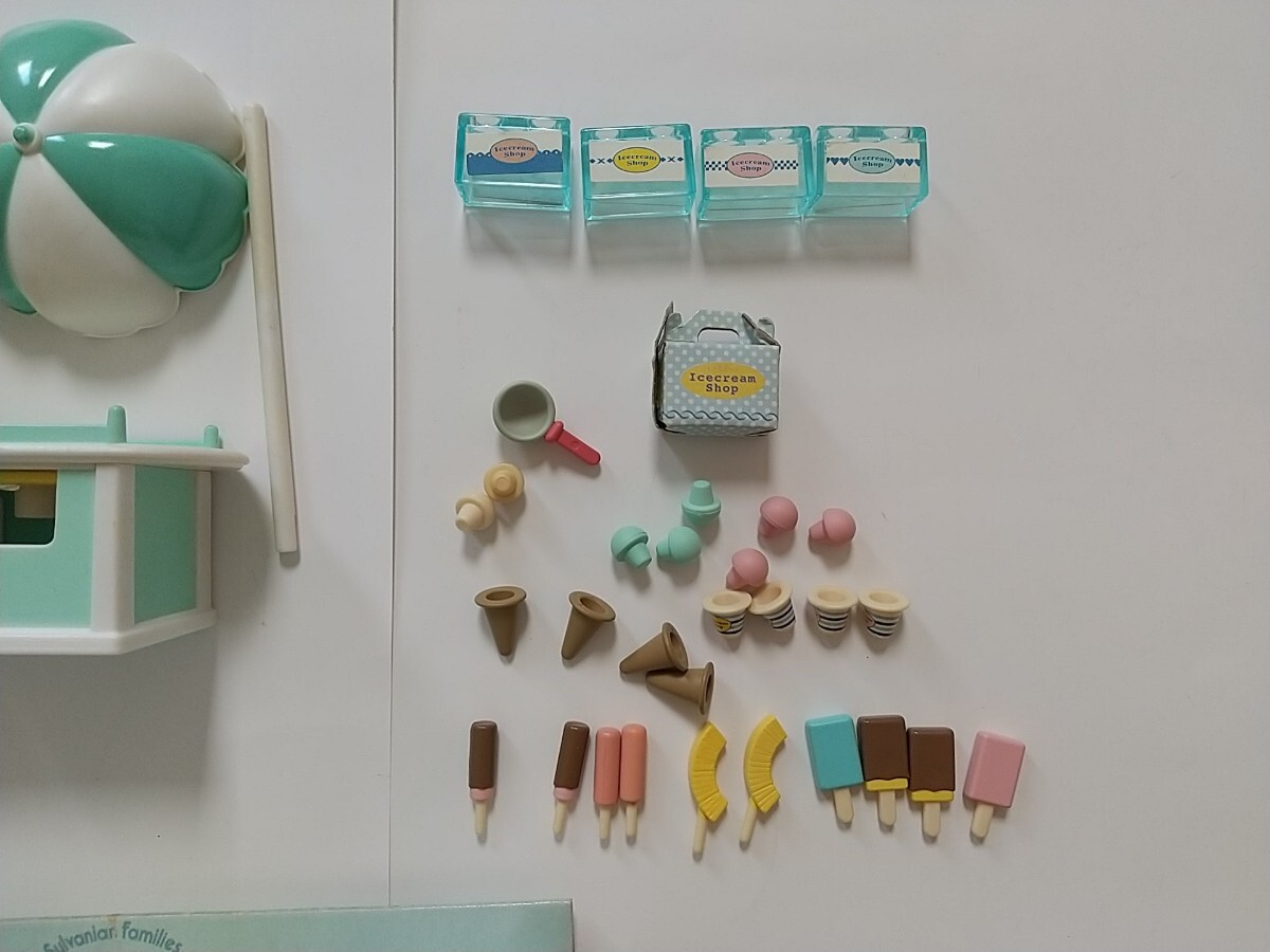 ベンチ、本体、パラソル、パラソル支柱、ダストボックス、ソフトクリームホルダー、ディッシャー、ギフトボックス、ソフトクリーム(バニラ、メロン、ストロベリー)、コーンカップ、カップ、アイススティック(チョコ、オレンジ、パイナップル)、アイスキャンディー(ソーダ、チョコ、ストロベリー)