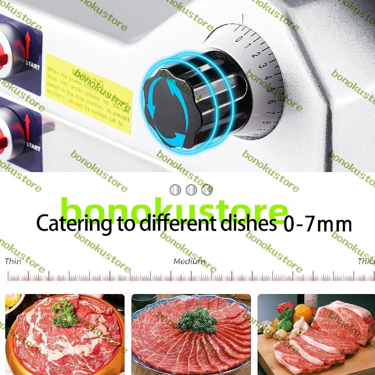 調節可能: 電動肉スライサーには調節可能な厚さノブが装備されており、スライスの厚さを 0 ~ 7 mm の範囲で簡単かつ正確に調節できます。この機能により、正確で均一なカットが保証され、効率的で便利なスライスを楽しむことができます。