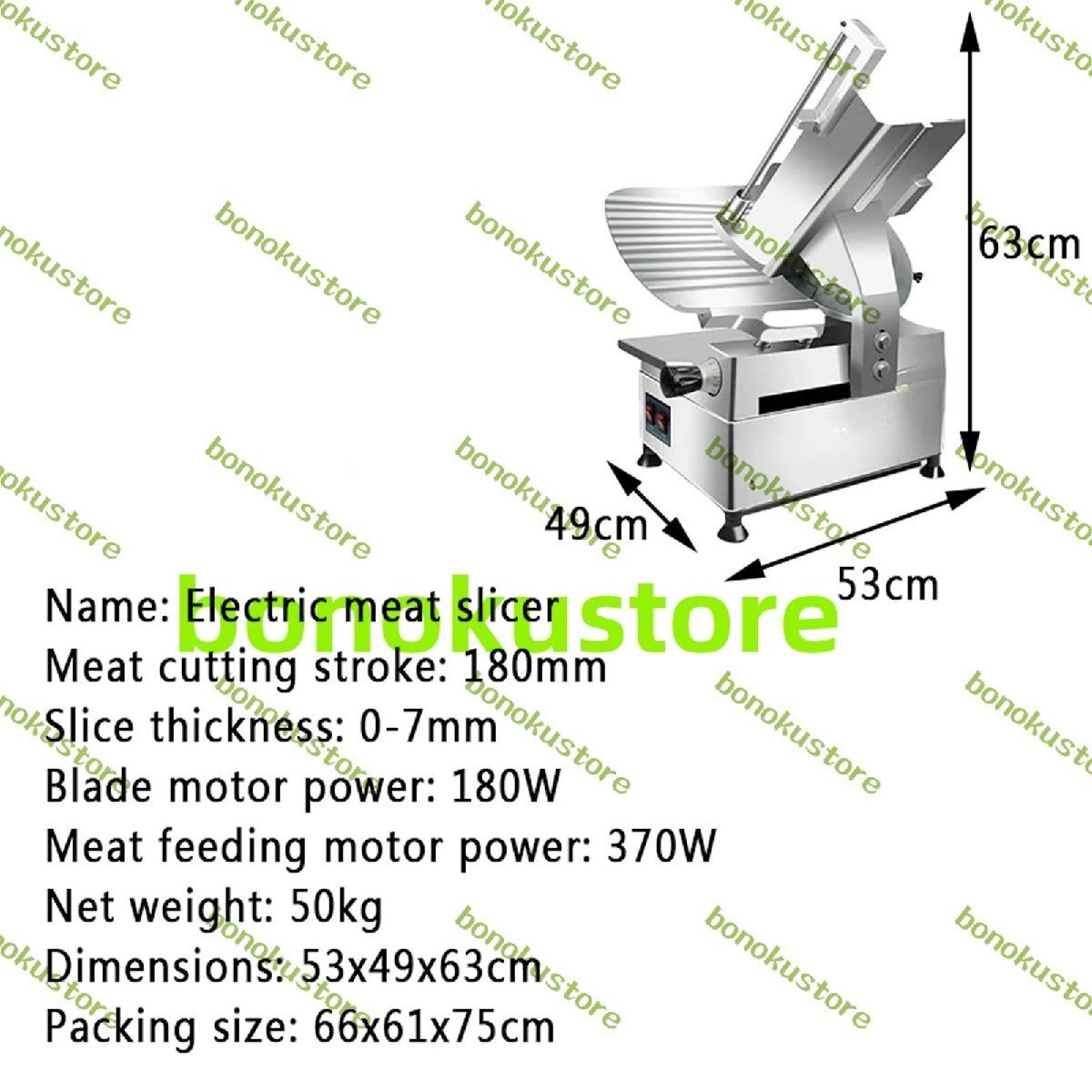 名称: 電動肉スライサー 肉切りストローク:180mm スライスの厚さ: 0?7mm ブレード直径: 300mm ブレードモーター出力: 180W 肉送りモーター出力: 370W 正味重量: 50kg 寸法: 53x49x63cm 梱包サイズ:66x61x75cm