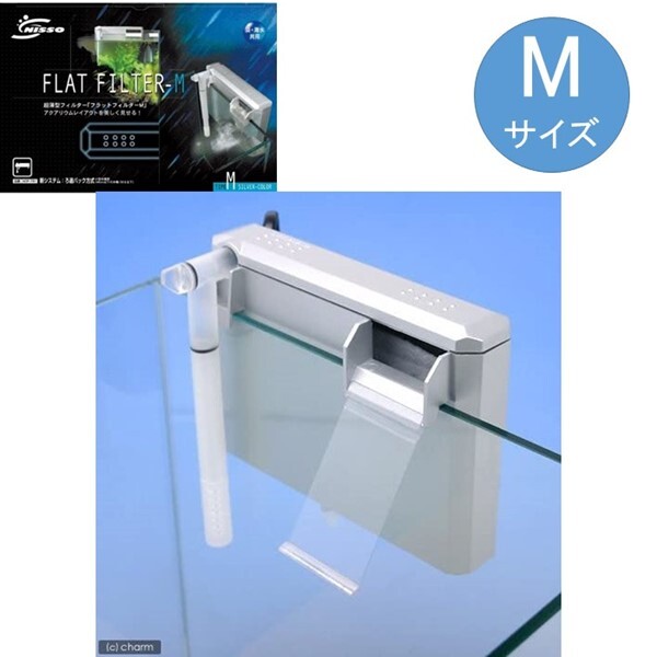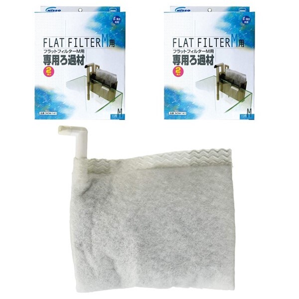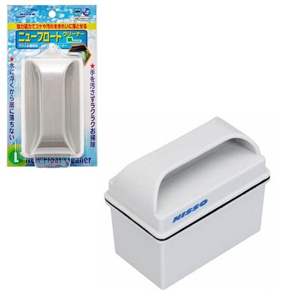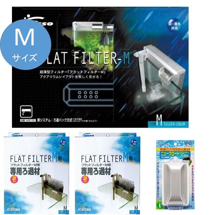 ニッソー NISSO 水槽用外掛式・ニッソー NISSO フラットフィルター M シルバー 水槽用外掛式 フィルター NOF-791 1点本体サイズ (幅X奥行X高さ) :23×4.7×16cm本体重量 :610g(4975637447657)・フラットフィルター M用 専用 ろ過材 NOM-141 2点(計4枚)(4975637473823)・ニューフロートクリーナーL 1点(4975637480784)水槽のコケ取りが、手を濡らさないで簡単に行うことができます。水に浮くマグネットクリーナーなので、水槽の底に落下せず砂利かみがありません。マグネットは本体に密閉されていますので、サビないから水槽に入れたままでも大丈夫です。本体同士をひもでつなぐ必要がないので、ガラスフタ、ライト、フィルター等を水槽に乗せたままでも使えます。削ぎ落とし面が、固いブラシ状なので、頑固なコケも楽に落とせます。水槽内のクリーナーが外れて、多少離れても強い磁力で引き寄せて、再度使用可能です。幅60cm以上の水槽などに使いやすいLサイズ。