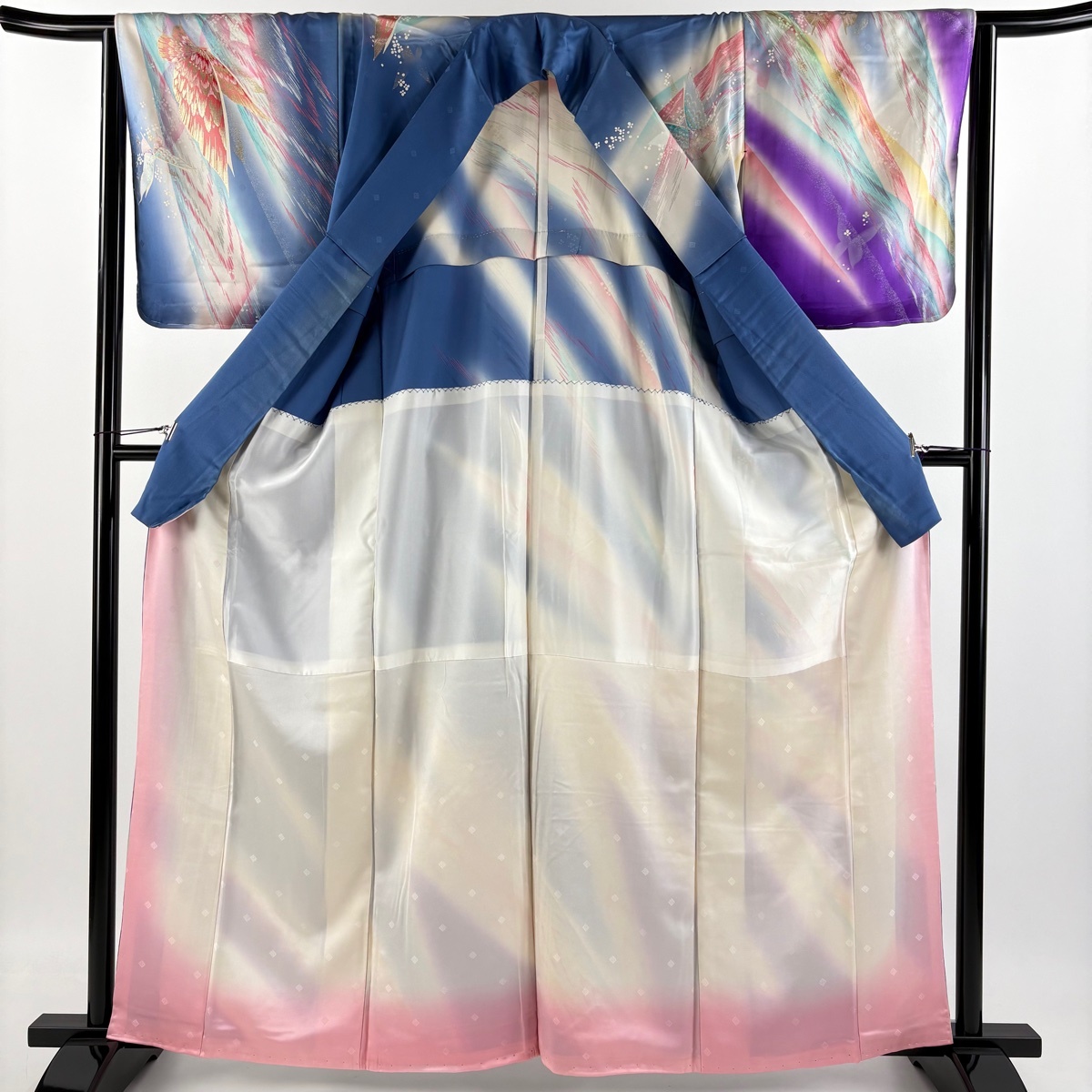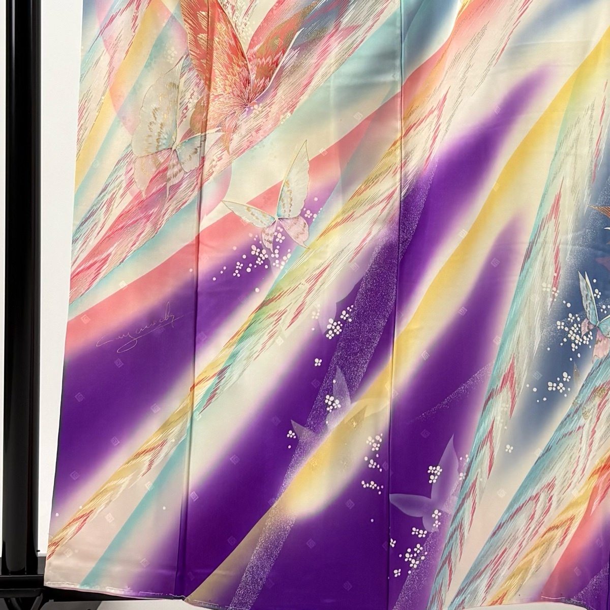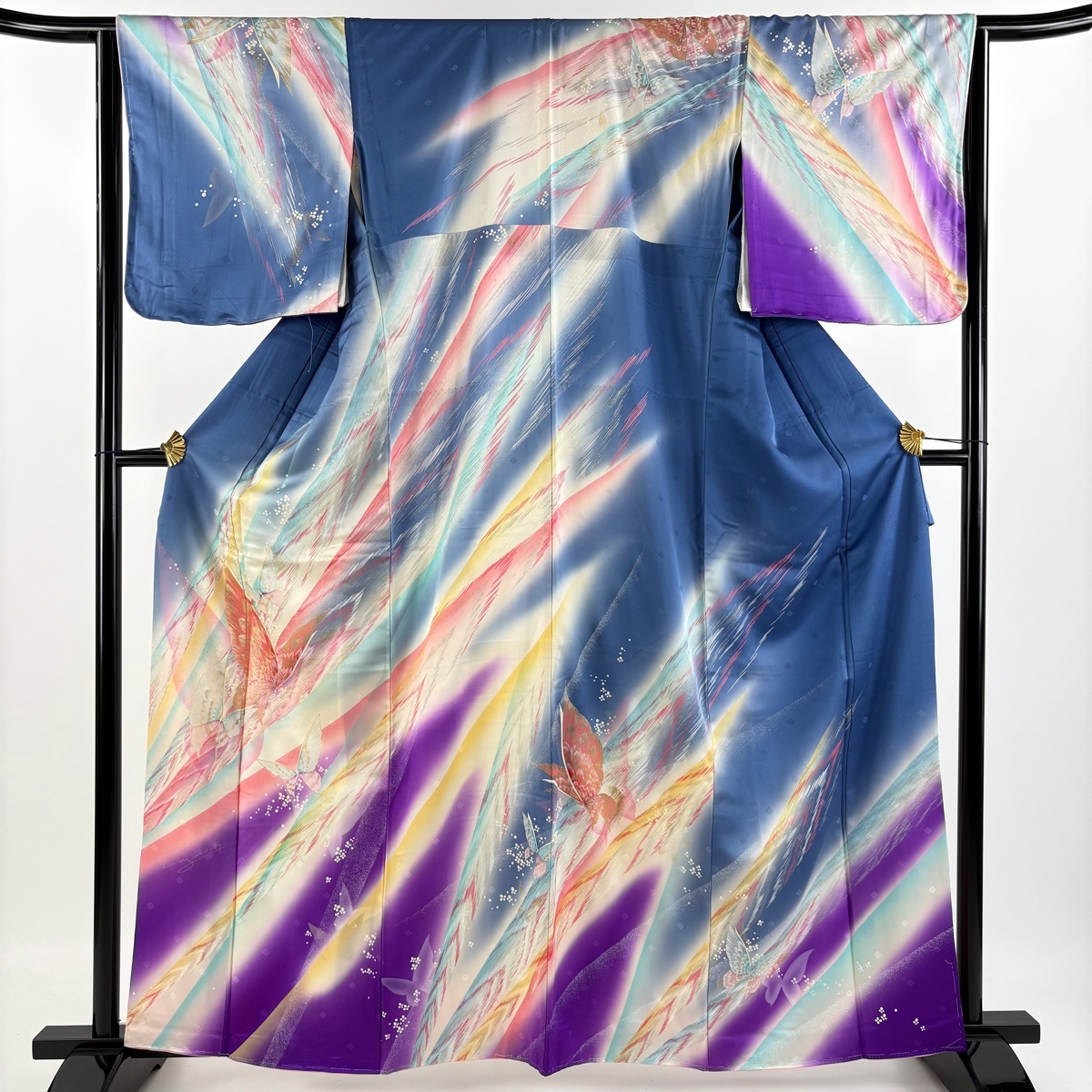 | 訪問着 秀品 落款 背抜き 蝶 幾何学 金銀彩 青灰色 袷 身丈162.5 裄丈65.5 M 正絹 【中古】 |