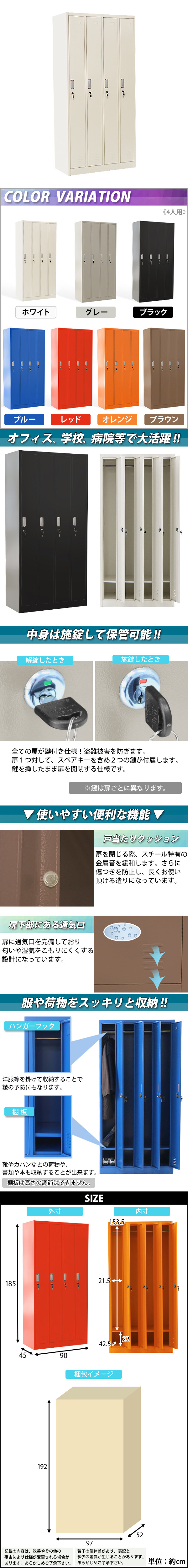 | 商品サイズ | ■本体寸法 約W 90×約D 45×約H 185(cm)(鍵は、合計8(内スペアキー4)個付属します。) ■ロッカー(内寸) 上段:約W 21.5×約D 42.5×約H 153.5(cm) 下段:約W 21.5×約D 42.5×約H 22(cm) ■梱包荷姿 約W 97×約D 52×約H 192(cm)/約52kg |