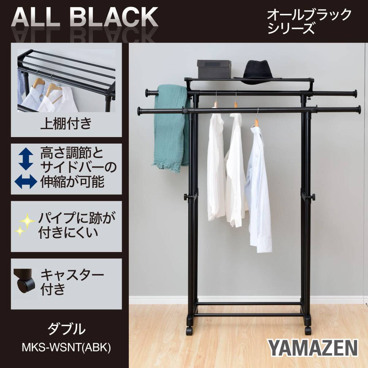 説明 山善「上棚付伸縮ハンガー ダブル MKS-WSNT(ABK)」 【便利な上棚付き】 上棚付きなので洋服だけでなく、カバンや帽子などの小物も一緒に収納できデッドスペースの有効活用になります。 【伸縮式サイドバー】 便利な伸縮式のサイドバーで、置く場所に合わせて幅を調節できます。ダブル構造でさらに収納力アップです。 【キャスター付きで移動がラクラク】 キャスター付きで掃除の際などにも移動させやすいです。 【パイプに跡が付きにくい高さ調節機能】 高さを95.5-158.5cmまで調節できるので、ロングコートにも対応しています。締め付け型の調節レバーなので、パイプに穴や傷ができにくくなっています。 ●本体サイズ(約):幅80-132×奥行51.5×高さ95.5-158.5cm ●ハンガーバーの下部からベース用パイプまでの距離:75-138cm ●棚板内寸 : 29.5×71cm ●耳伸び部 : 26cm ●全体耐荷重:32kg(ハンガー1本あたりの耐荷重 : 15kg、棚板の耐荷重 : 2kg) ●材質:構造部材/金属(スチール)・ポリプロピレン、表面加工/エポキシ樹脂塗装 ●お客様組立品 ●東証プライム(株)山善で扱うすべての商品は、国内の第三者機関において、JIS基準に基づいた試験に合格しております