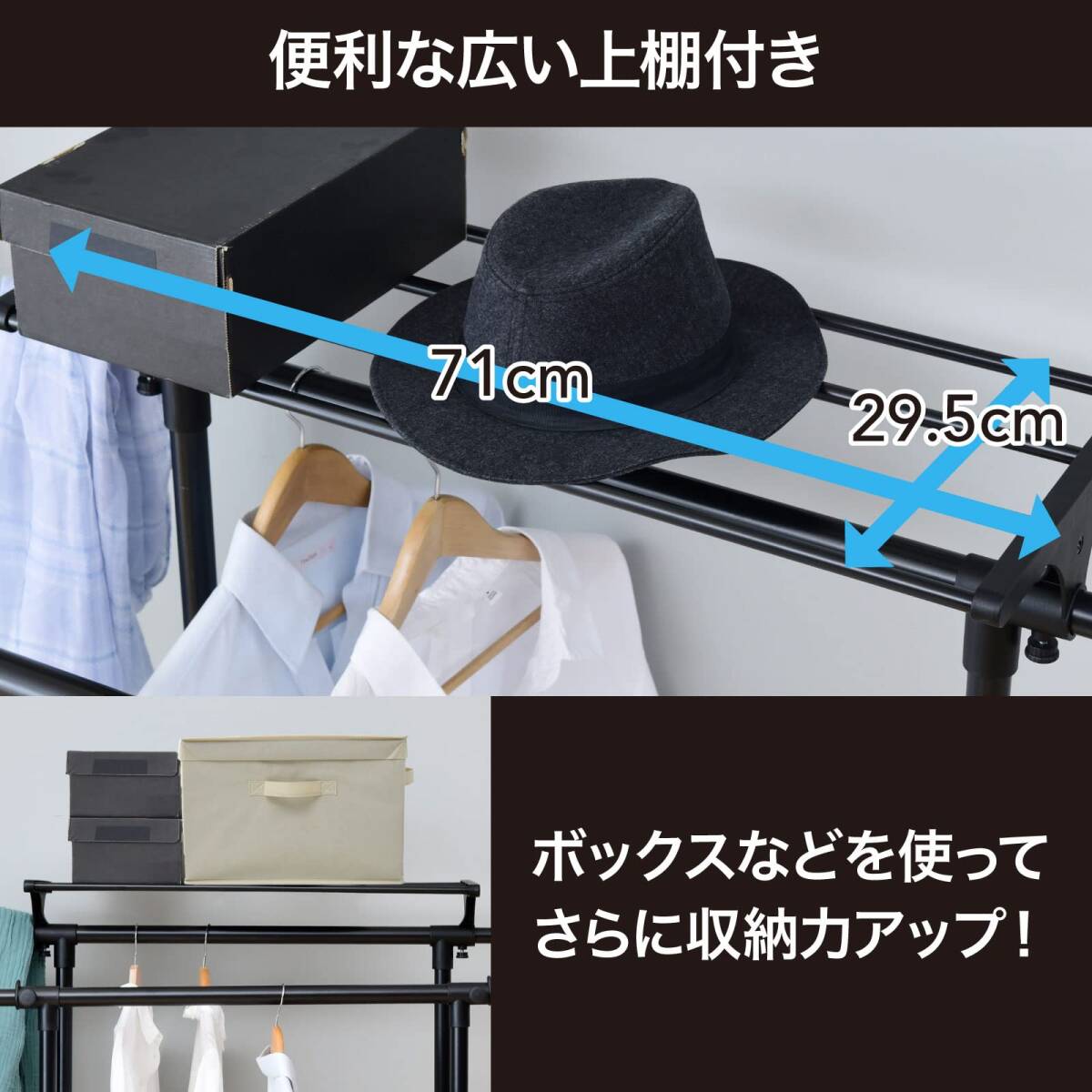 ・【便利な上棚付き】上棚付きなので洋服だけでなく、カバンや帽子などの小物の収納にも便利です。上棚に収納用ボックスなどを置けば、収納力をさらにアップできます。