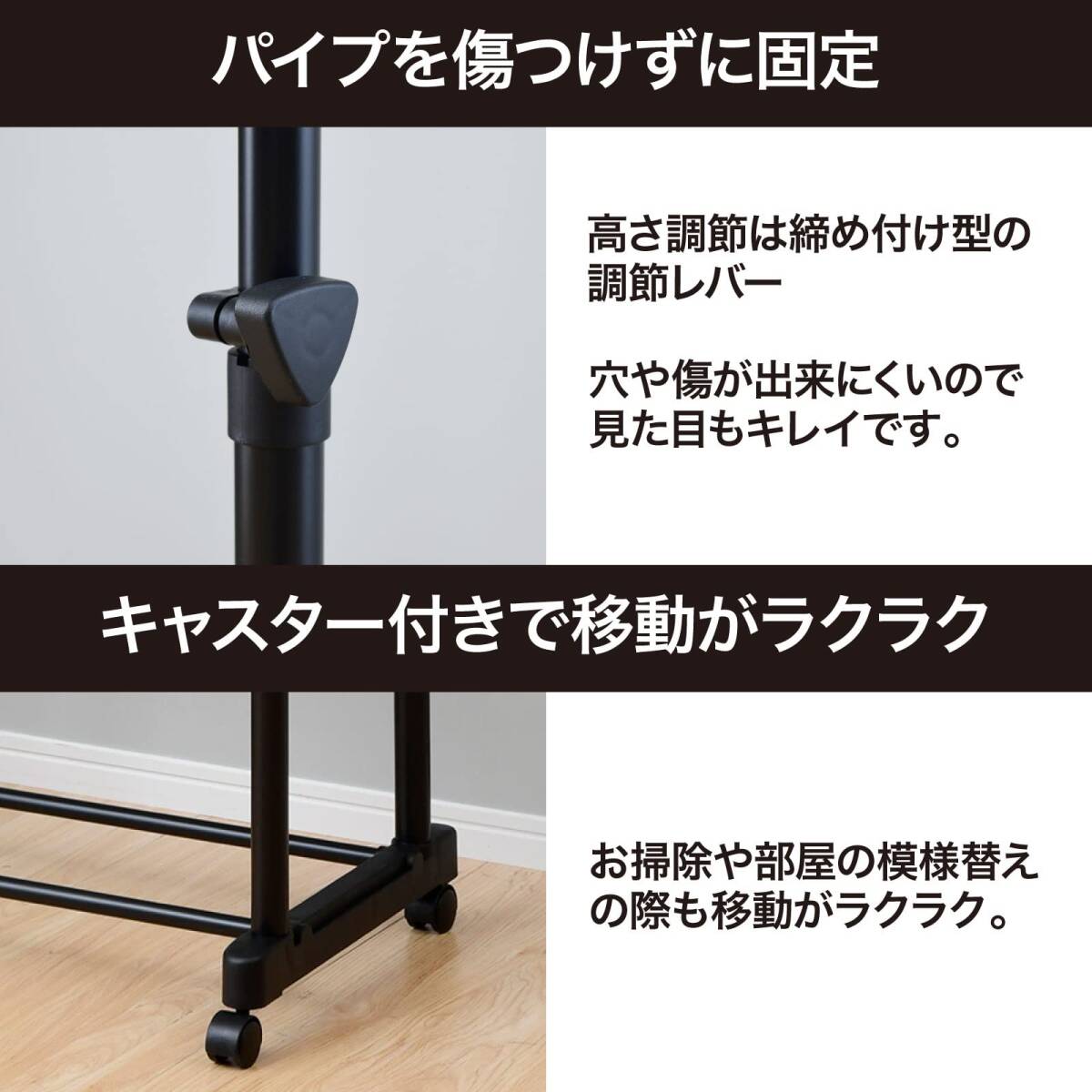 ・【パイプに跡が付きにくい高さ調節機能】高さを95.5-158.5cmまで調節できるので、ロングコートにも対応しています。締め付け型の調節レバーなので、パイプに穴や傷ができにくくなっています。