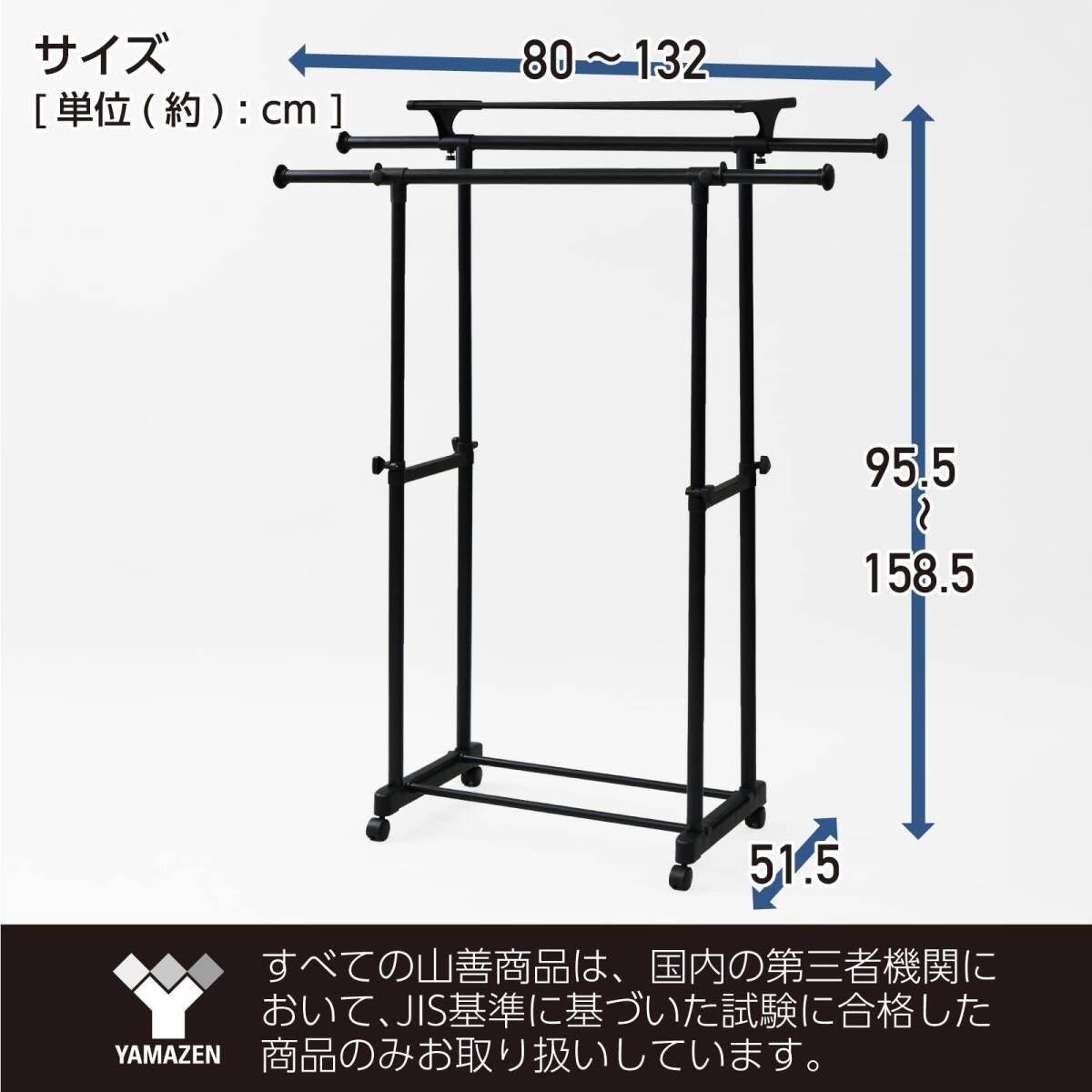 [山善] ハンガーラック キャスター付き 幅80-132×奥行51.5×高さ95.5-158.5cm (上棚付き/伸縮/高さ調節可能/ダブル)