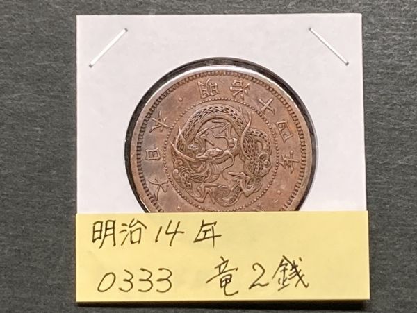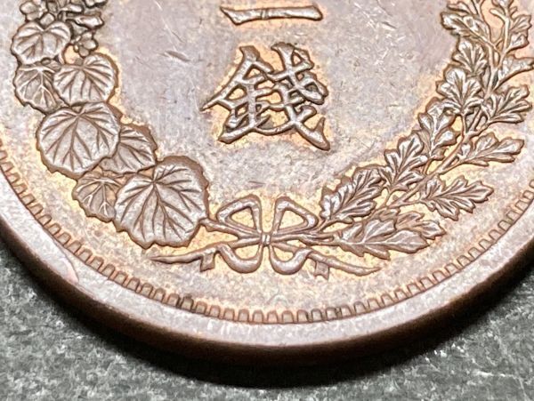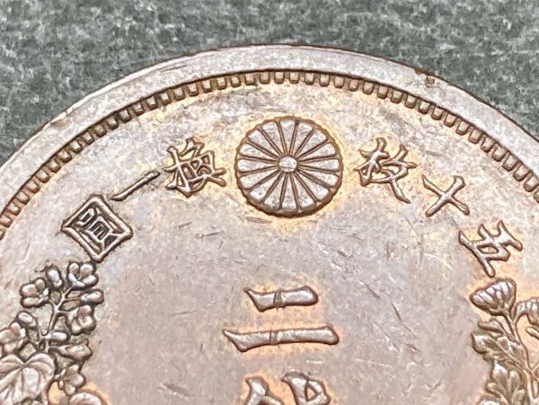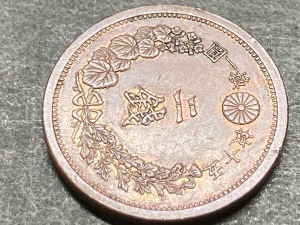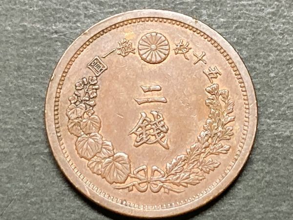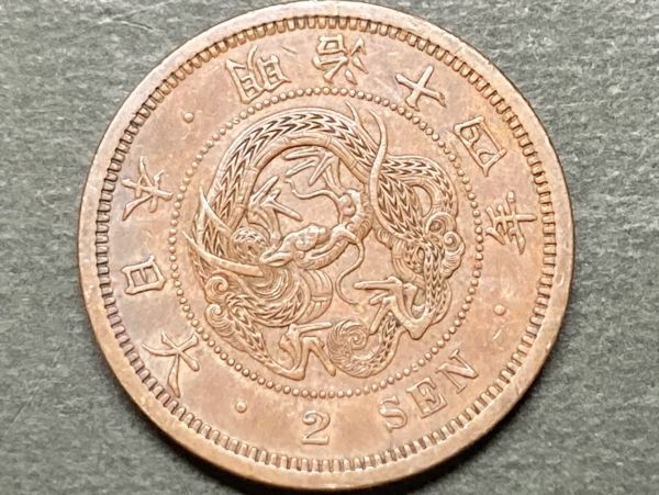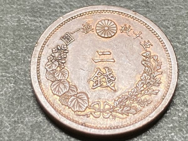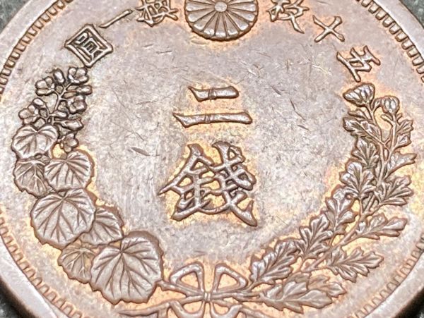 製造時の輝きが大変多く残っているきれいな2銭銅貨です