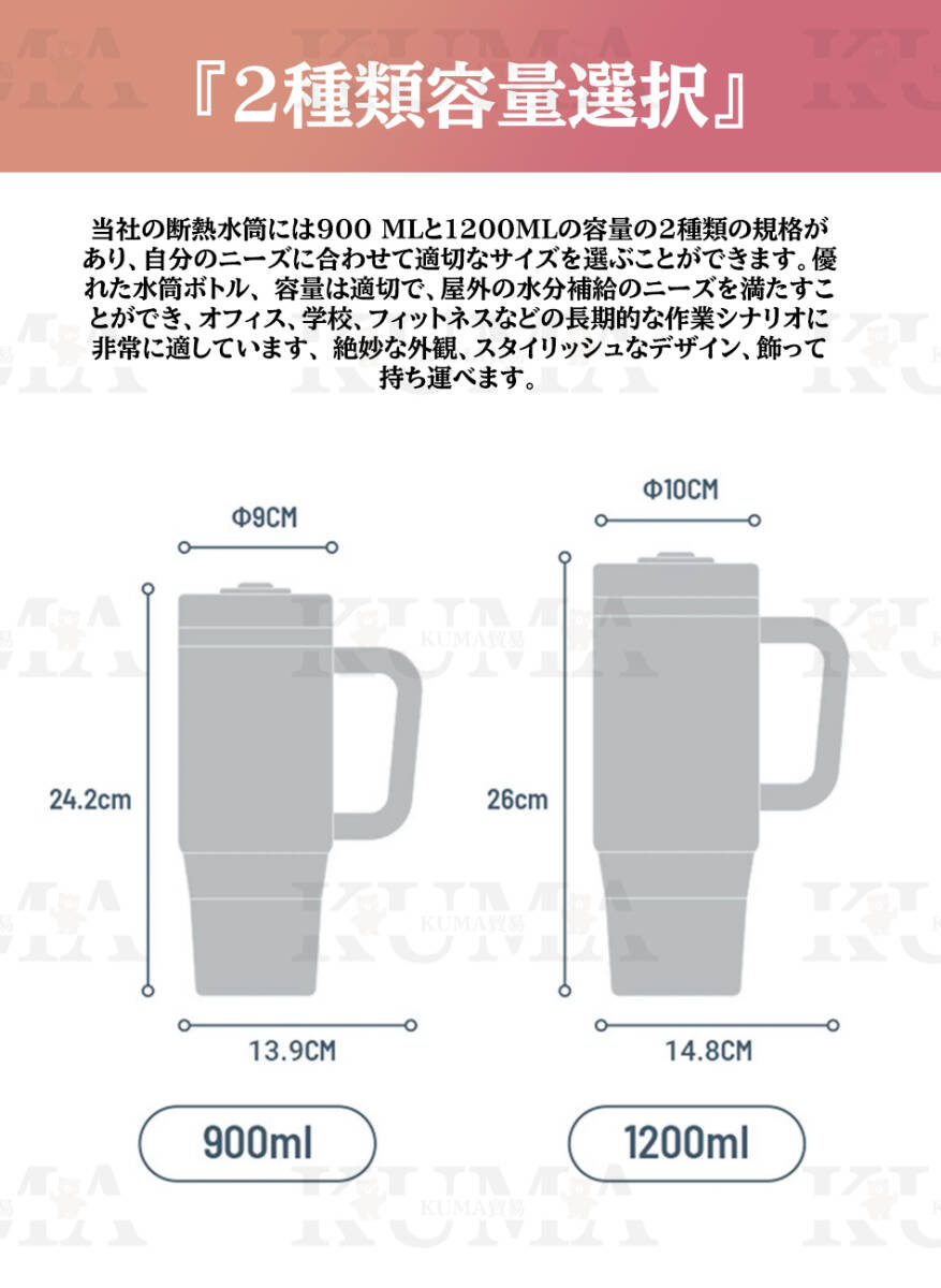 【プレミアム品質と耐久性】当社の900ml断熱水筒は、長期的な性能を確保するためにプレミアム品質の材料から作られています。 頑丈なハンドルと漏れ防止設計で、家の周りでも、ジムでも、アウトドアアドベンチャーでも、毎日の使用に最適です。