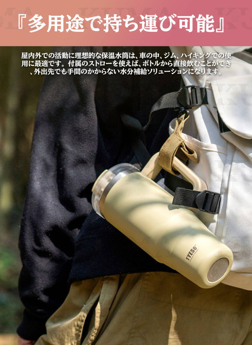 【多用途で持ち運び可能】屋内外での活動に理想的な保温水筒は、車の中、ジム、ハイキングでの使用に最適です。 付属のストローを使えば、ボトルから直接飲むことができ、外出先でも手間のかからない水分補給ソリューションになります。