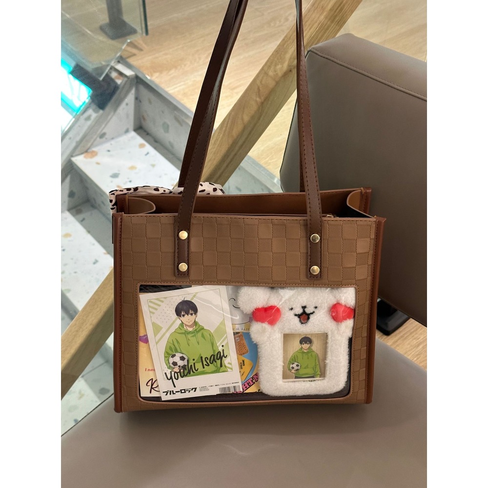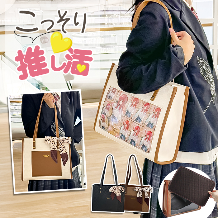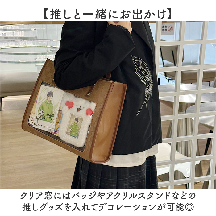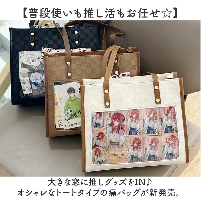 商品説明 | ・・【普段使いも推し活もお任せ☆】 ・大きな窓に推しグッズをIN♪オシャレなトートタイプの痛バッグが新発売。 ・【推しと一緒にお出かけ】 ・クリア窓にはバッジやアクリルスタンドなどの推しグッズを入れてデコレーションが可能◎ ・【バッグを傷つけないプレート】 ・バッジを刺せる専用のメッシュプレート付き。バッグを傷つけないのも嬉しいポイント。 ・【普段使いもしやすい見た目】 ・くるっと裏にするだけでシンプルな見た目のバッグに♪普段使いにもピッタリ☆ ・【長めのハンドルで肩掛けも】 ・バッグのハンドルは長めに設計し、アウターの上からでも肩掛けがしやすい。 ・【ちょうどよい収納力が魅力】 ・コンパクトに見えて、しっかり収納できるサイズ感。ペットボトル、ペンライトも入っちゃう。 ・【付属のリボンで可愛さUP】 ・付属のリボンを取付ければさらに可愛さが上がるデザイン♪ ・【便利な外ポケットも】 ・すぐに取り出したいチケットなどを入れるのに便利な外ポケットも装備。 ・【ポケット仕様】 ・アウトポケット・・・オープンポケット×1 |