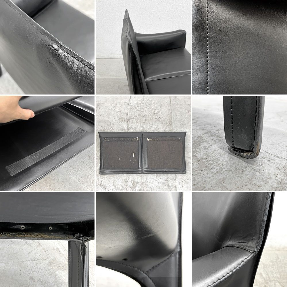 コンディション | 経年により、レザー特有のカビのにおいが生じております。表面には擦れや線傷、微細なひび割れが全体的に見受けられ、背もたれ部分には型崩れやシワ、内部フレームの痕が浮き出ています。さらに座面裏の張り地には擦れや破れがございます。 なお、本体レザーは専門業者による染め直しメンテナンスを施しており、見た目の印象は一定程度回復しております。販売当時のタグや脚キャップも残存しております。 全体的にダメージや使用感はございますが、構造的な不具合やガタつきはなく、美しいデザインも引き続きお楽しみ頂けるコンディションを保っております。 ※特筆すべきコンディションは出来るだけ記載させて頂きますが、細かい擦れや傷、汚れ等を完全にお伝えする事は出来ません。画像をご確認の上、ご入札をご検討下さいませ。 ※取扱説明書や保証書等は記載が無い限り付属いたしません。 |