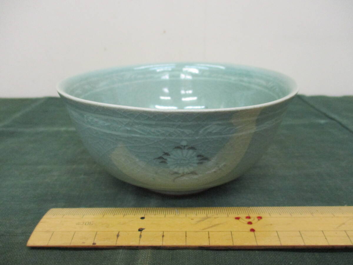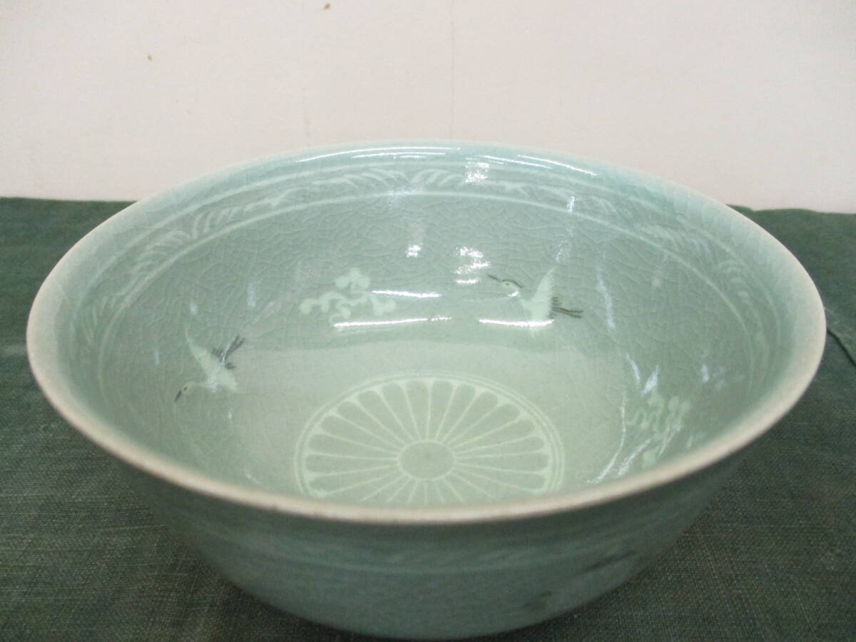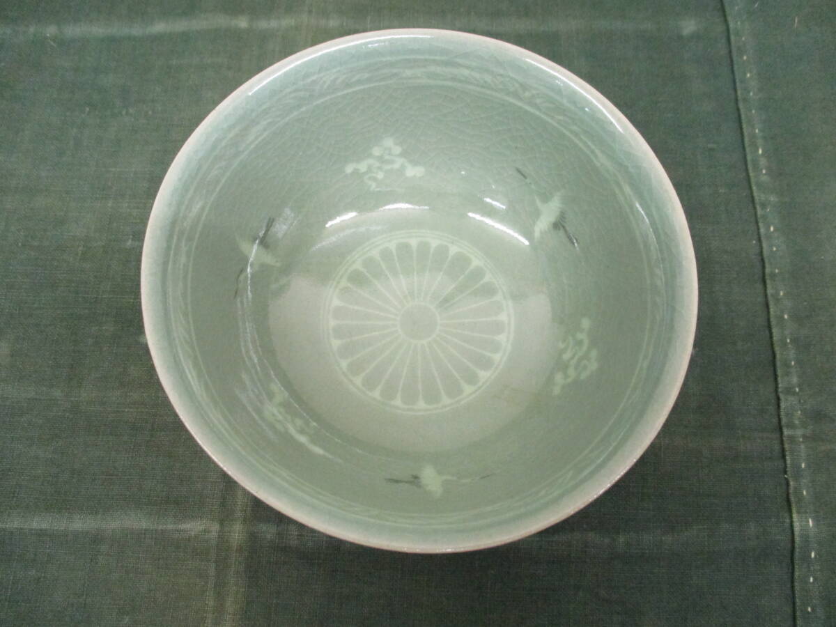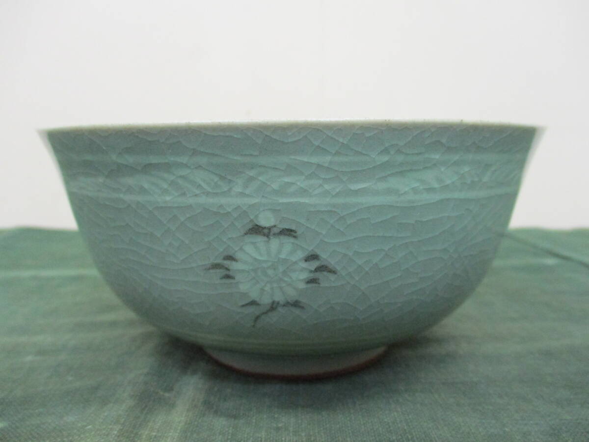 ●備考:高麗青磁白黒象嵌雲鶴文様茶碗です。やや腰を張り、重心を下げた造りになります。