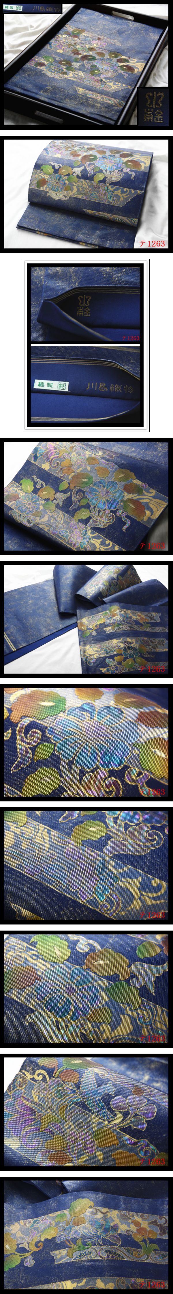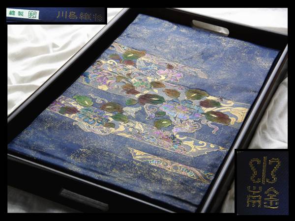 蔵【テ1263】厳選逸品 名門川島織物 螺鈿箔 本金 唐草花鳥紋 青藍色地 正絹太鼓柄高級美術袋帯 ◇検簪着物名古屋帯和装小物帯締め