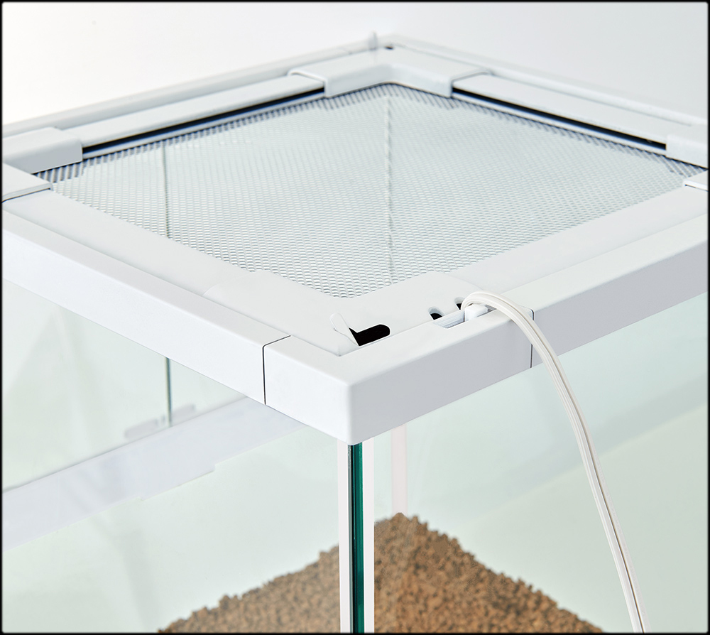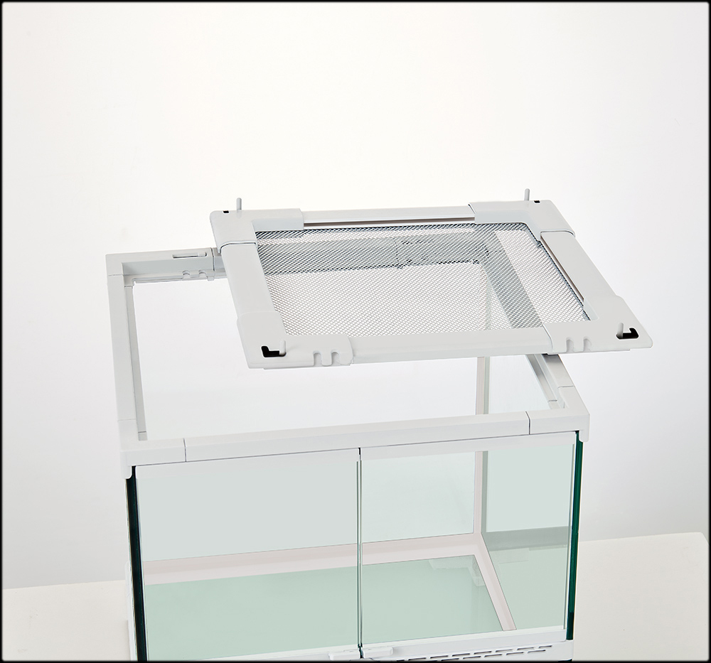 金属でできている部分もありグラステラリウムよりも作りがしっかり、ガッチリしている感じがします。これは間違いなくヒットすると思います。しいて言えば、フロントの通気口が単純なつくりなので、生体がバタバタすると床材や水がこぼれてきそうな感じがします。小さいデュピアは出てしまう大きさですね。デュピアに関してはどっちにせよガラス扉の隙間から出てしまうのでグラテラも一緒かな~ とは思うのですが、水や床材に関してはグラテラのほうは内側の通気口が上を向いておりこぼれないように工夫されております。あとは配線穴がちょっと小さいような気がしますが、それぞれ逆にメリットになる場合もありますね。