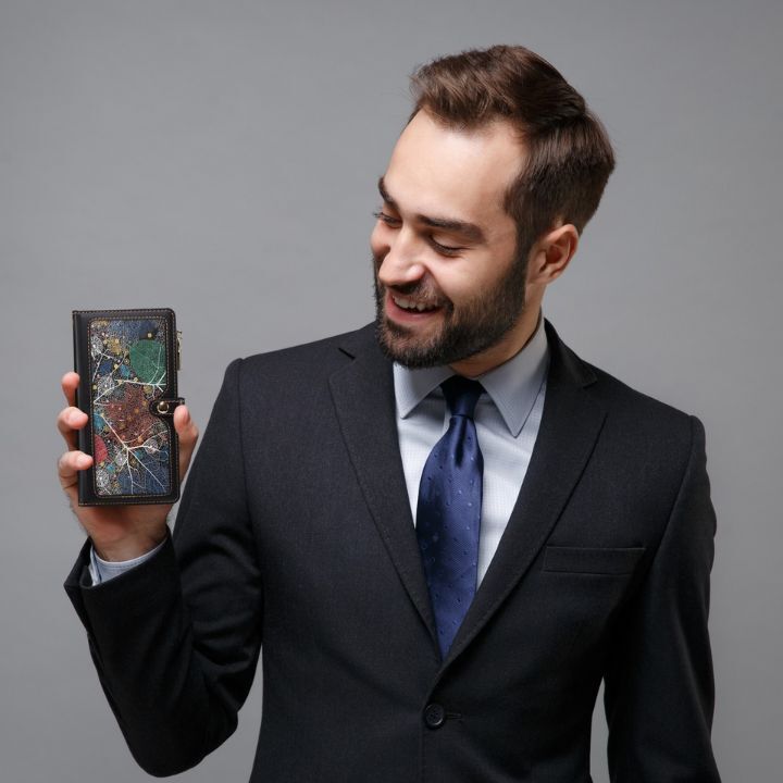 葉脈模様をあしらった高級PUレザー製スマホケースです。