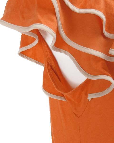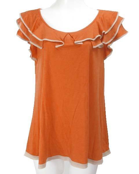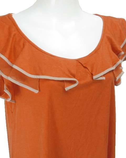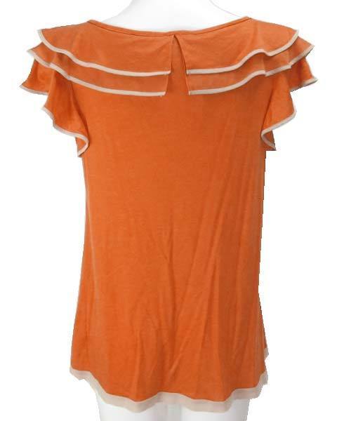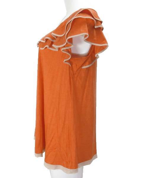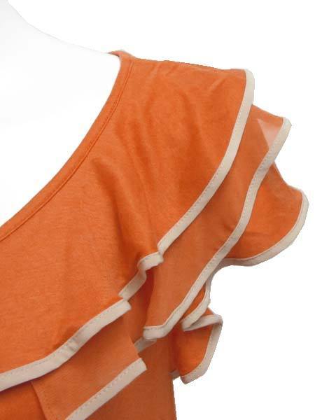 | オレンジにベージュトリミングのフェミニンなカットソー。お顔周りが華やかになります。お首周りから肩にかけてのフリルが可愛い。レギパンやストレートパンツなどと、オシャレをお楽しみください。 |